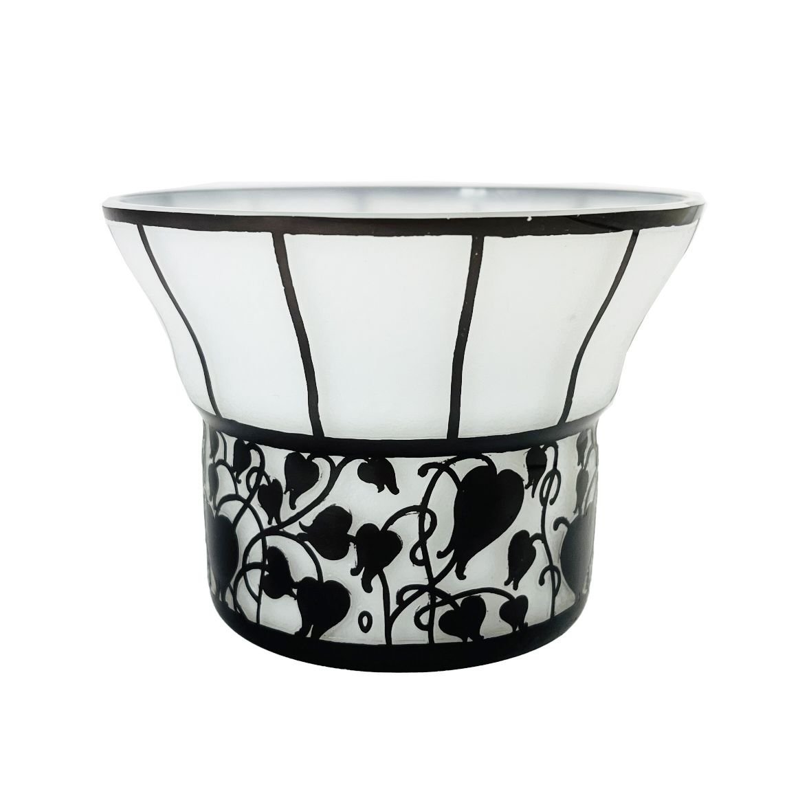 Florero austrohúngaro en cristal Loetz diseñado por Hans Bolek, c. 1915, en cristal color blanco opalino tallado «flores» en relieve. 9 x 12.3 cm.