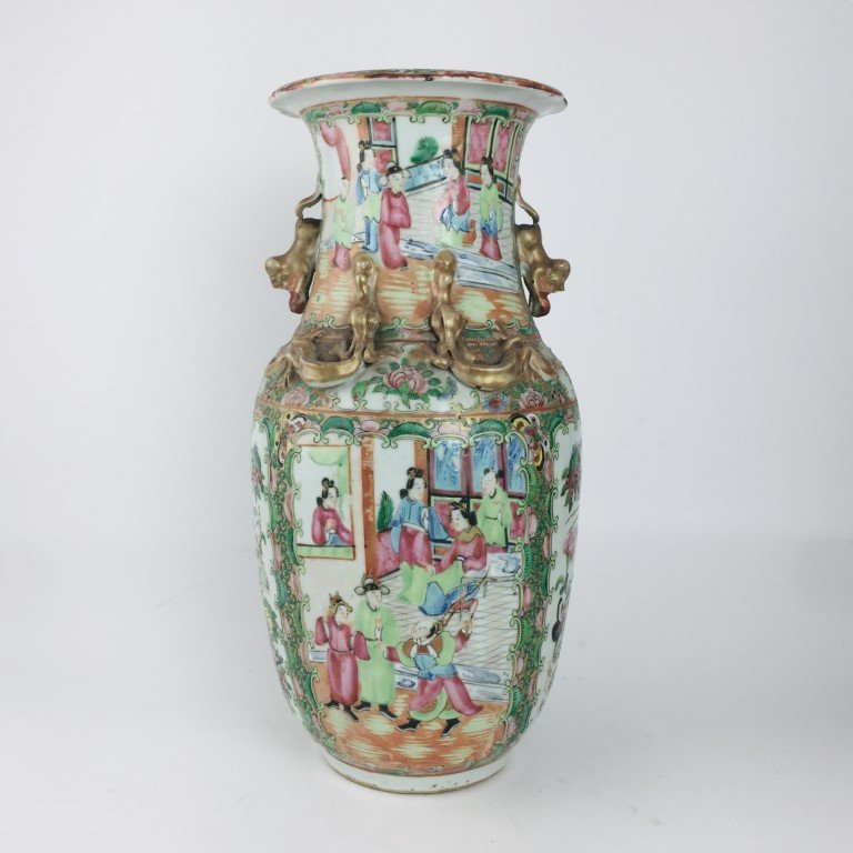 Florero chino en porcelana Cantón decorado «dragones, lagartijas y perros» en relieve con detalles en dorado. 36 x 18 cm.