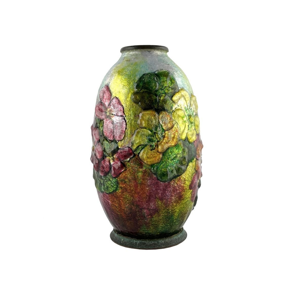 Florero francés en cobre y esmalte Limoges policromado, decorado «flores» en relieve. Firmado C. Faure en la base. 11.5 x 7 cm.