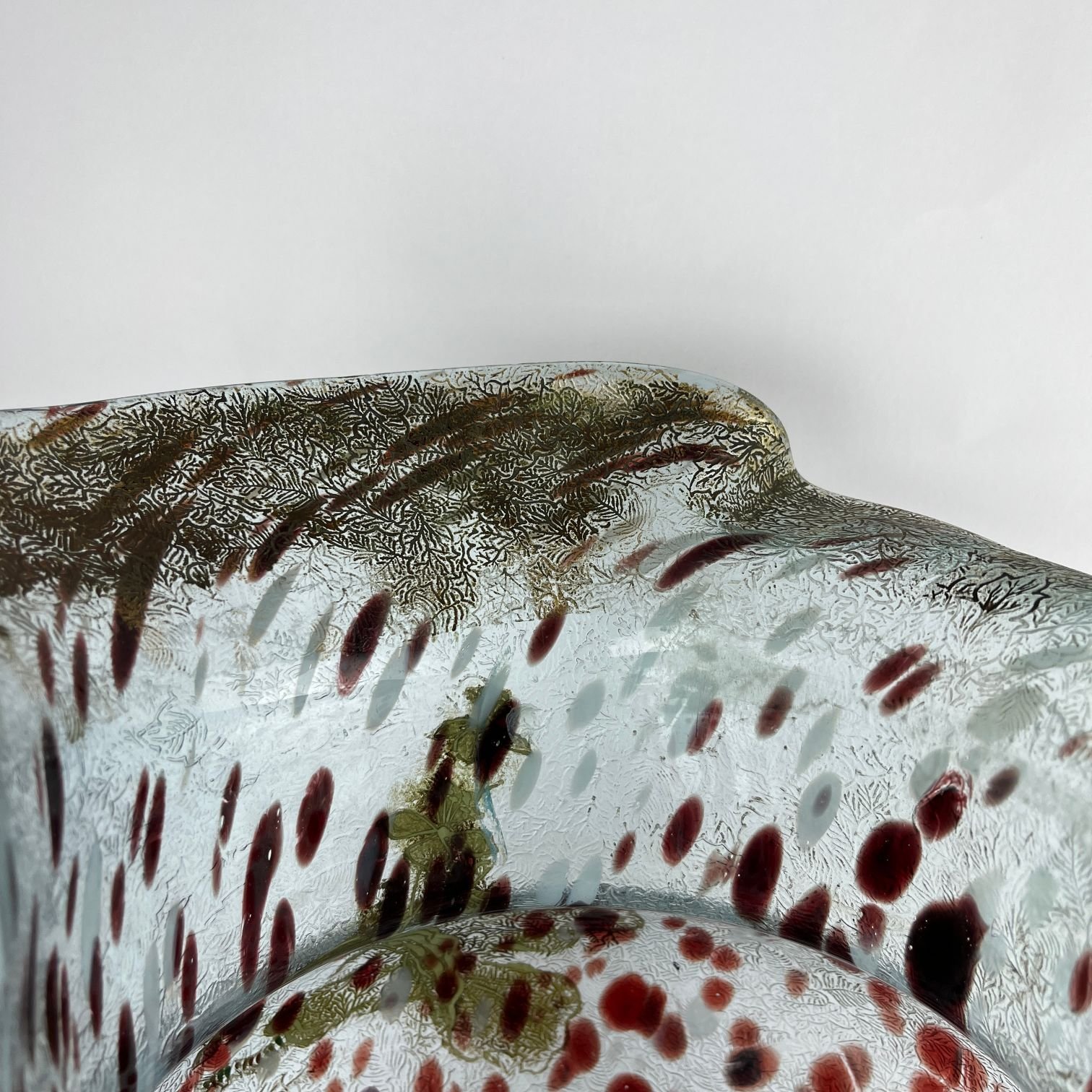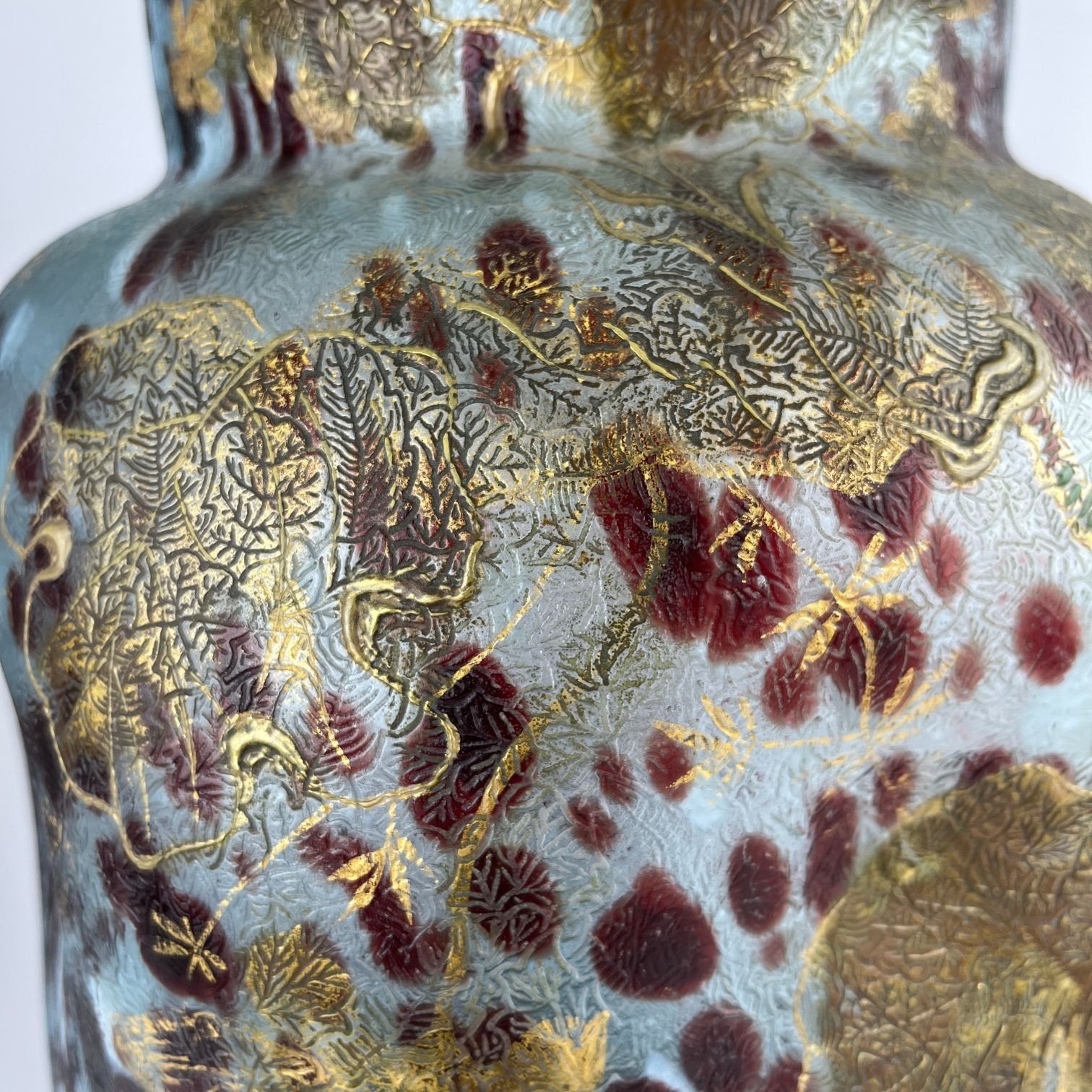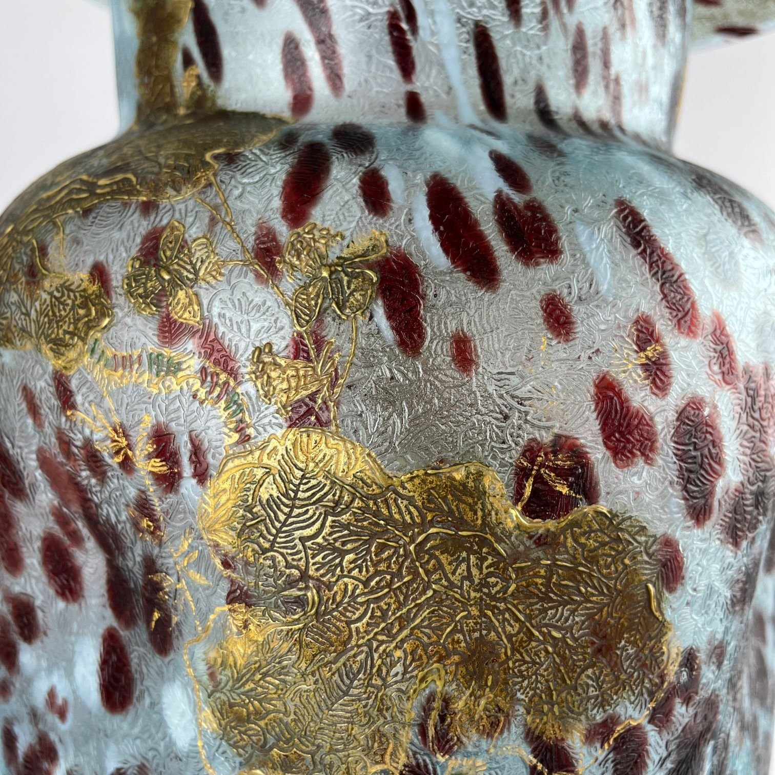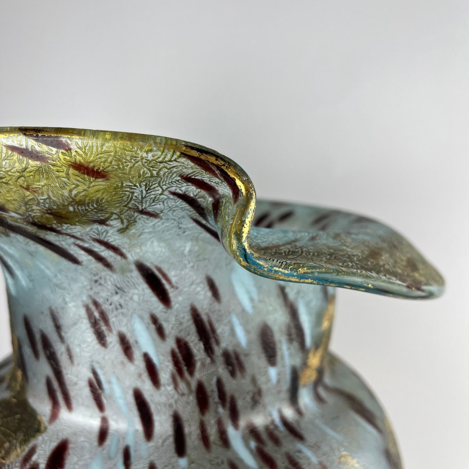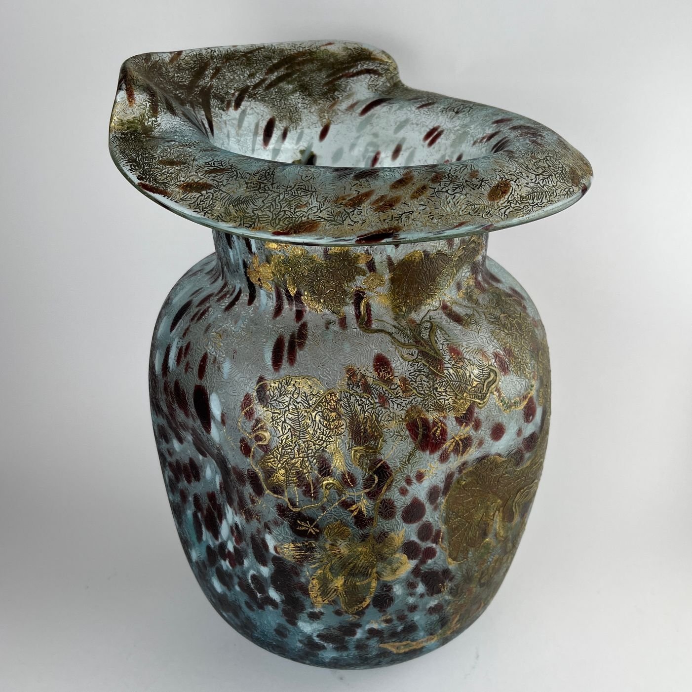 Florero italiano en cristal de Murano color celeste, bordeaux y blanco, decorado «hojas y flores» con detalles en dorado. 37 x 27 cm.