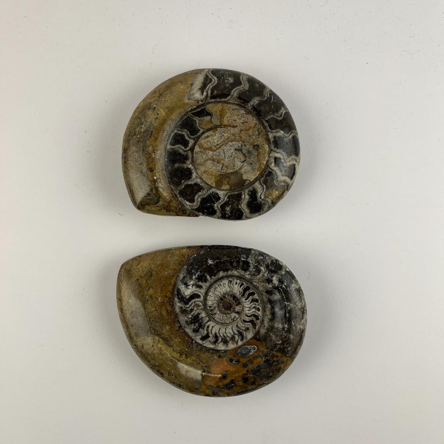 Fósil de amonita seccionado en dos mitades. Diámetro 10 cm.