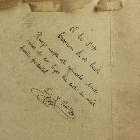 Fotografía. Fachada de la tienda «La Favorita» de Larghero y Conti, ciudad de Salto. Con dedicatoria manuscrita en anverso.