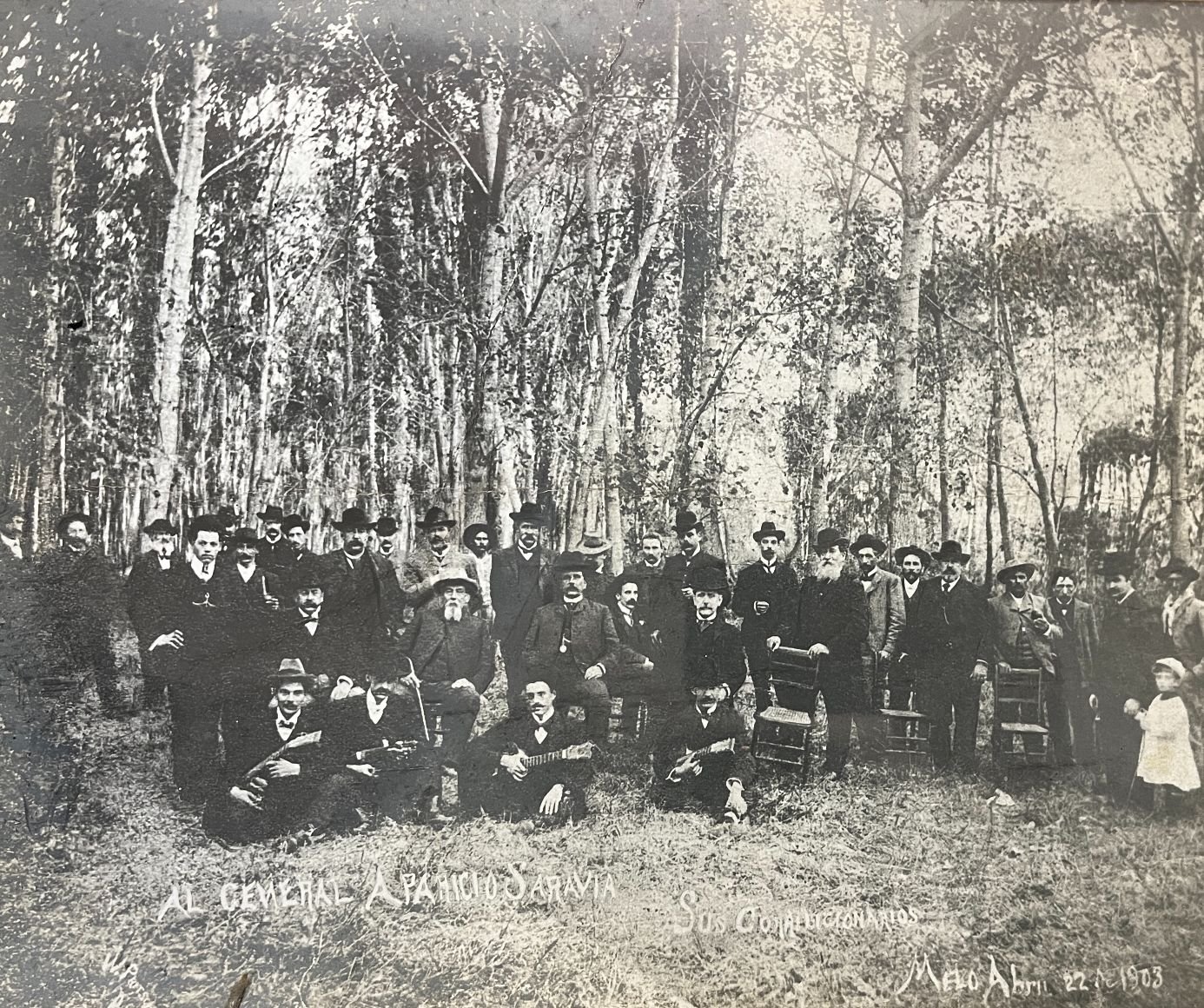 Fotografía. «Al Gral. Aparicio Saravia. Sus correligionarios. Melo. Abril 22 de 1903.» 23 x 29 cm.
