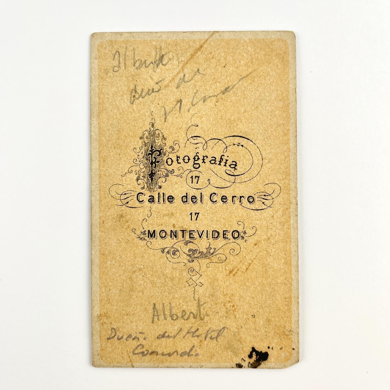 Fotografía vintage en formato carte-de-visite: 9,2 x 5,5 cm. Soporte secundario: 10,3 x 6,4 cm. Detrás, la publicidad impresa de la casa fotográfica y una leyenda manuscrita en lápiz: “Albert Dueño del Hotel Concordia, de la ciudad de Salto, Uruguay”.