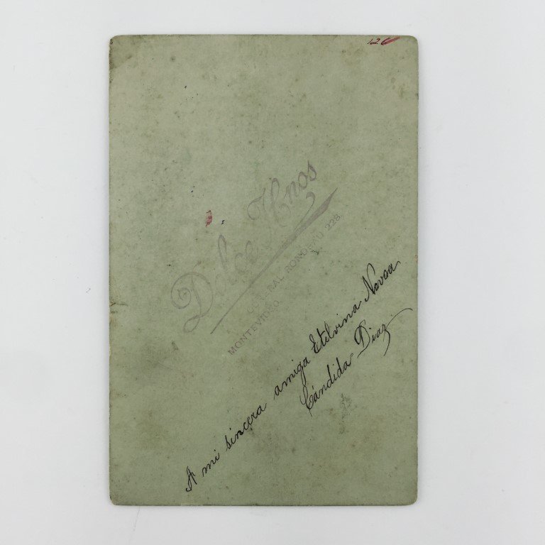 Fotografía gabinete. «Retrato de Cándida Díaz de Saravia, mujer de Aparicio Saravia.» Dedicada y autografiada al dorso por la retratada. Dolce Hnos., Montevideo.