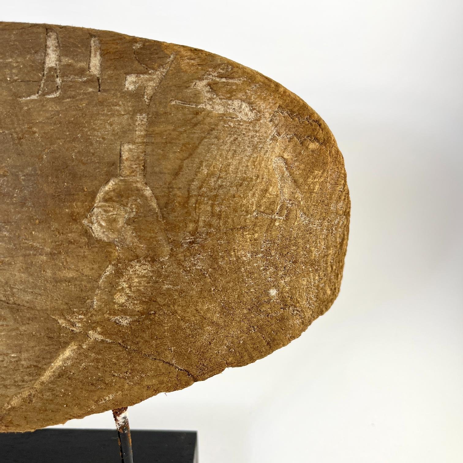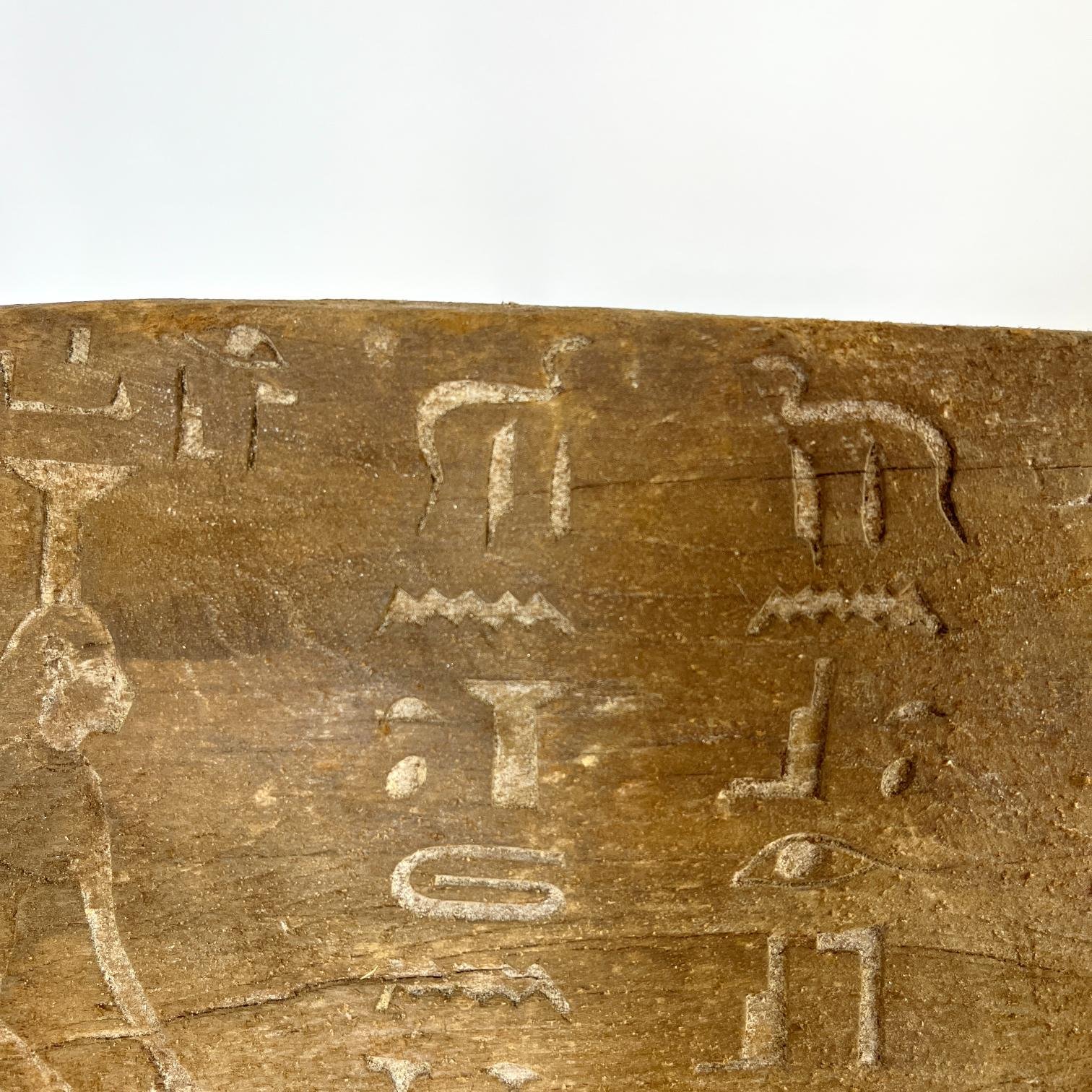 Fragmento de sarcófago del antiguo Egipto, en madera de cedro tallada “jeroglíficos” y diosas Neftis e Isis. Baja época (664-323 a.C.). Largo 31 cm. Se adjunta certificado realizado por J. Bagot, Barcelona, y certificado de Interpol realizado por Timeline Auctions, Inglaterra.