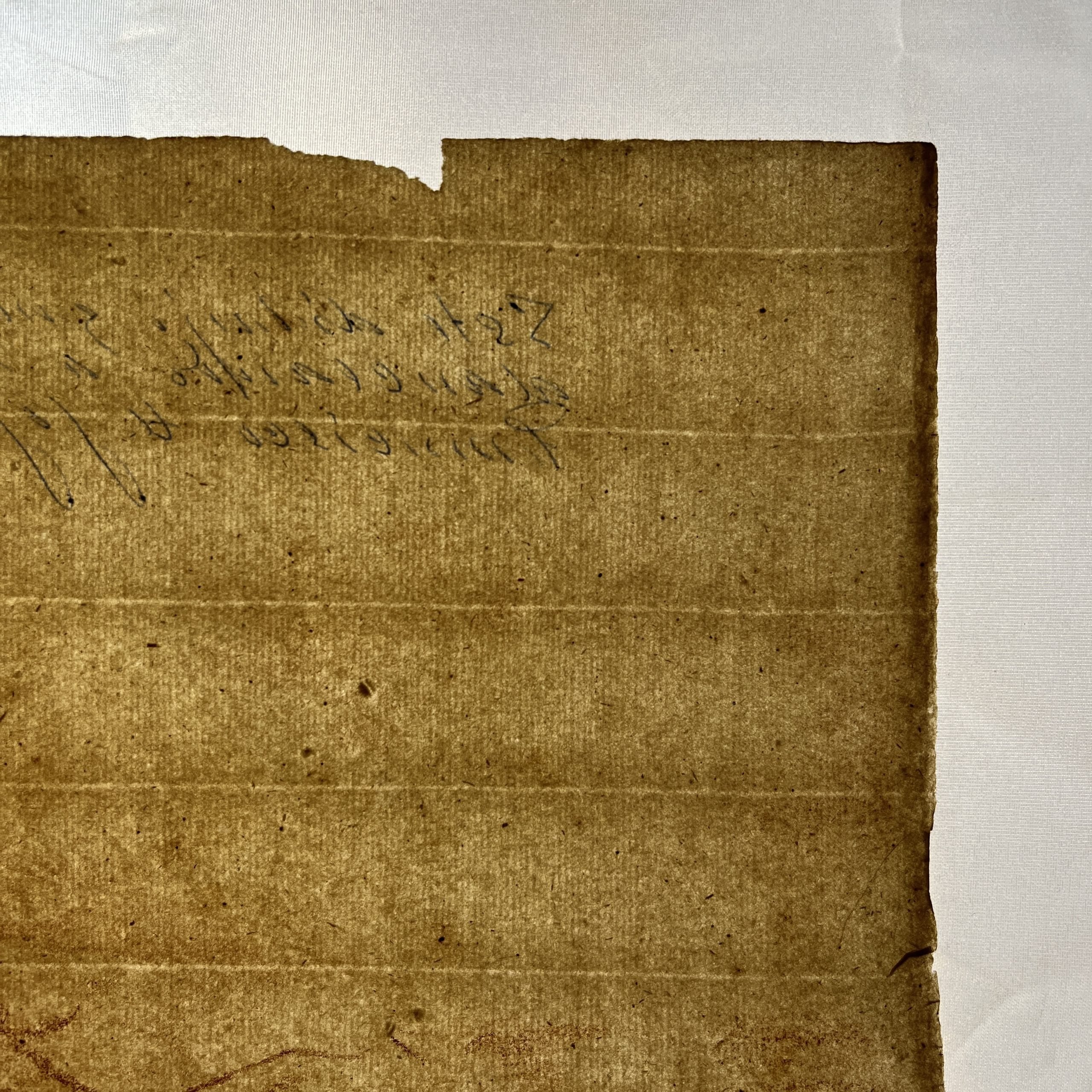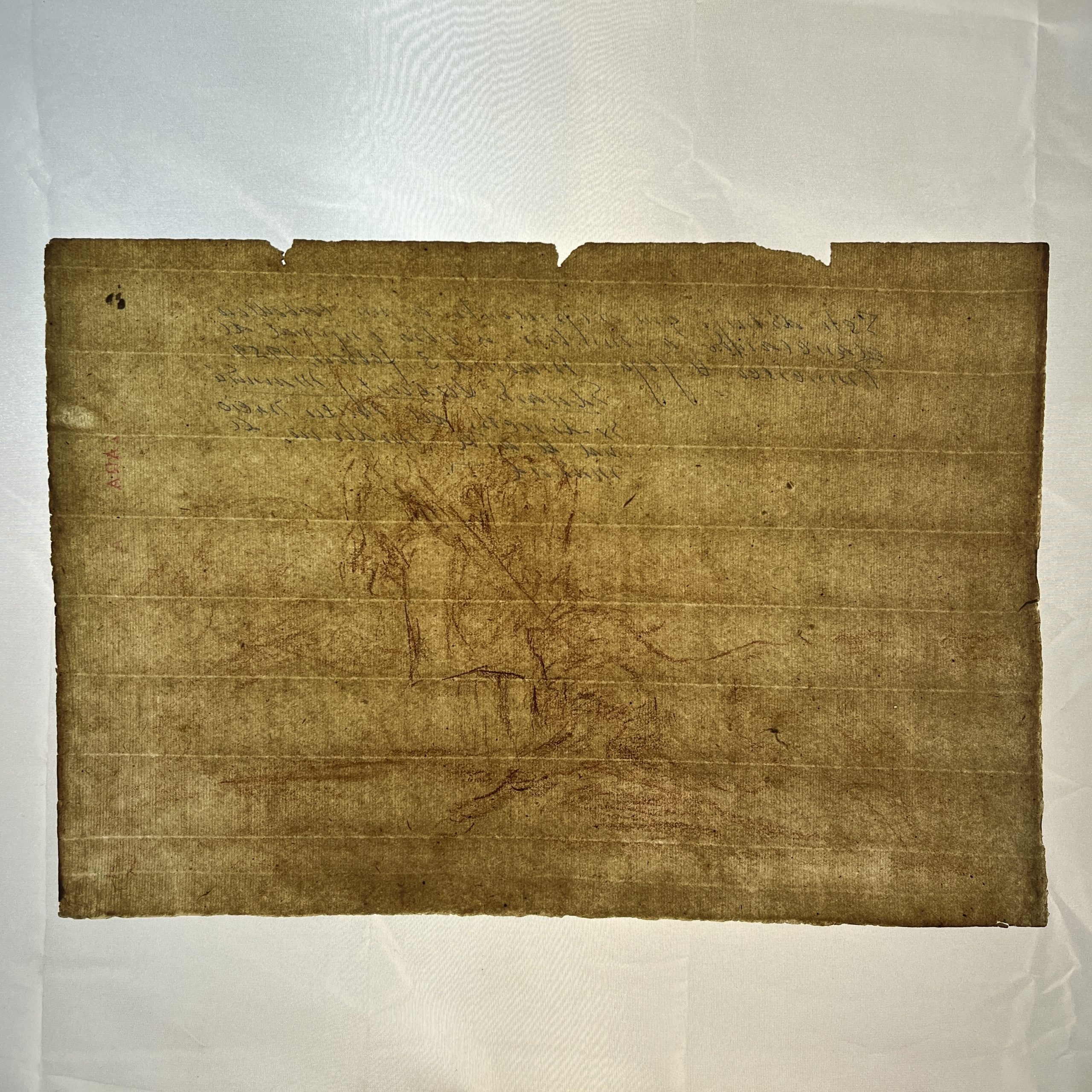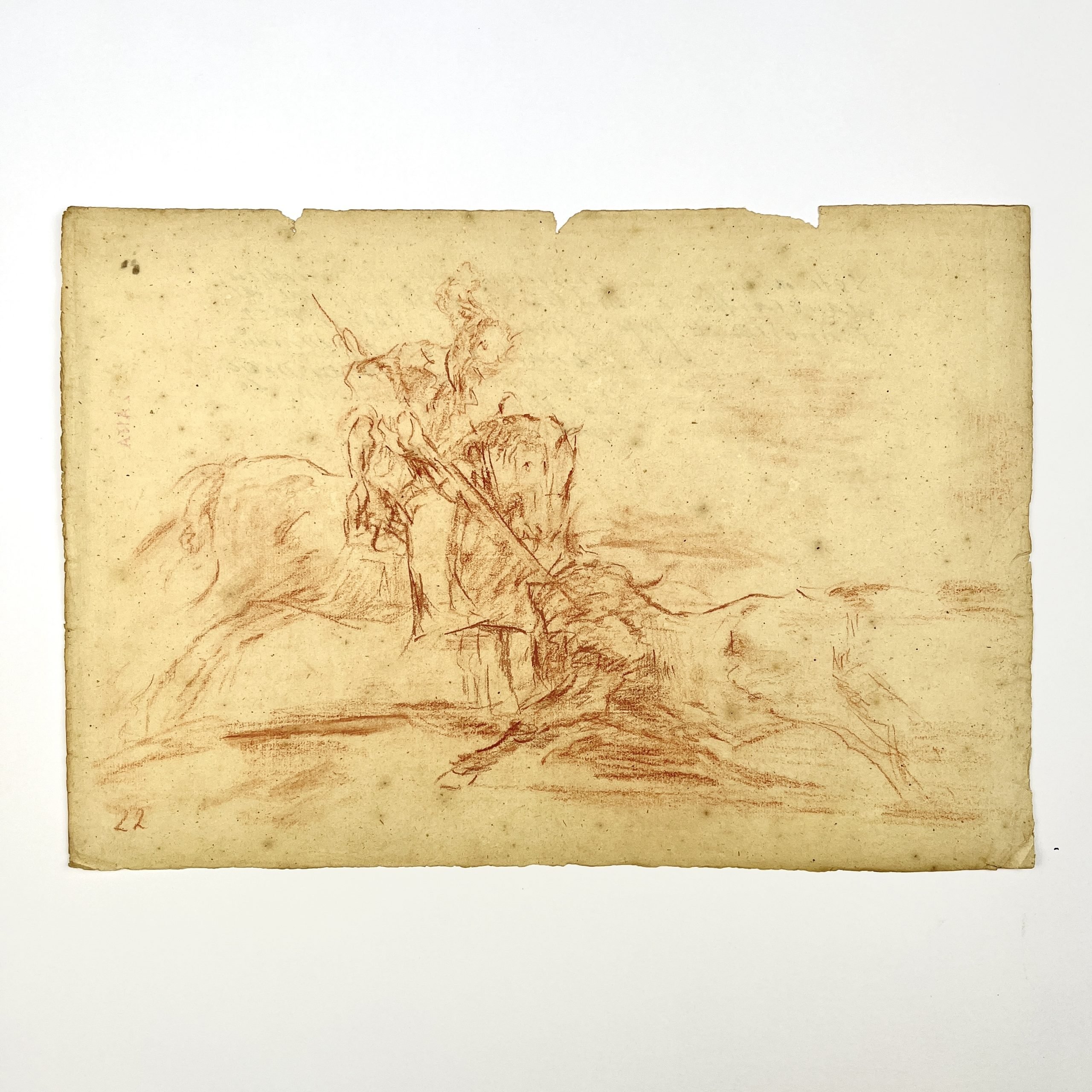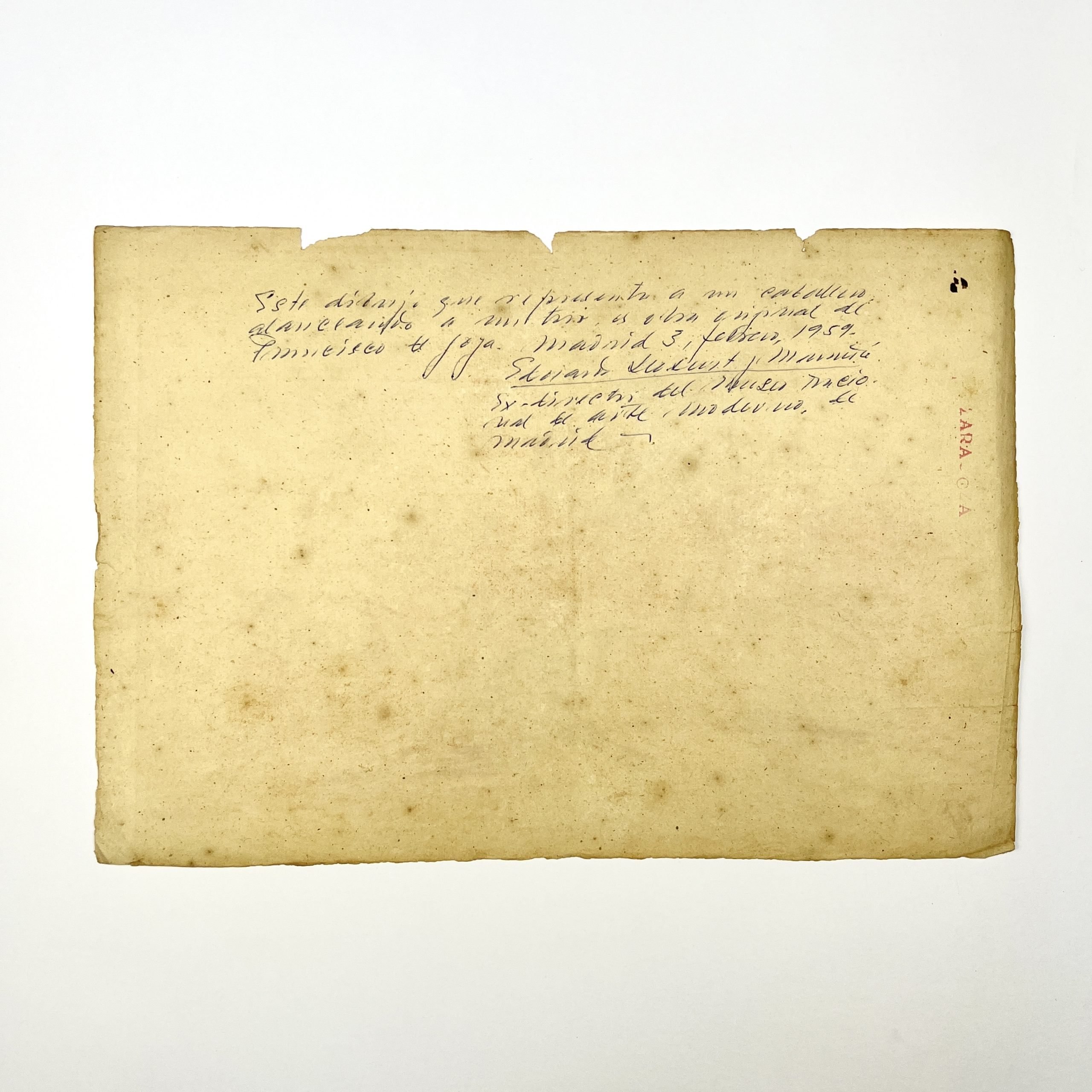 Al dorso sello húmedo en tinta roja con inscripción “Zaragoza”; certificado de puño y letra por Eduardo Llosent y Marañón, ex director del Museo Nacional de Arte Moderno de Madrid, con fecha 3 de febrero de 1959: “Este dibujo que representa a un caballero alanceando a un toro es obra original de Francisco de Goya.”