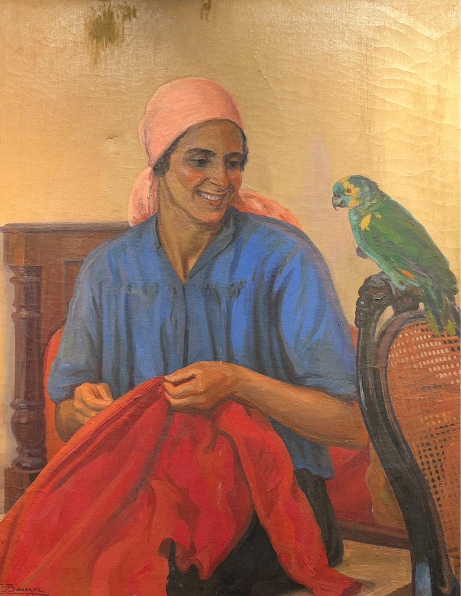 FRANCISCO E. BAUZER (Escuela argentina, 1887-1945) Óleo sobre tela «Dama con loro» Firmado abajo a la izquierda 100 x 80 cm