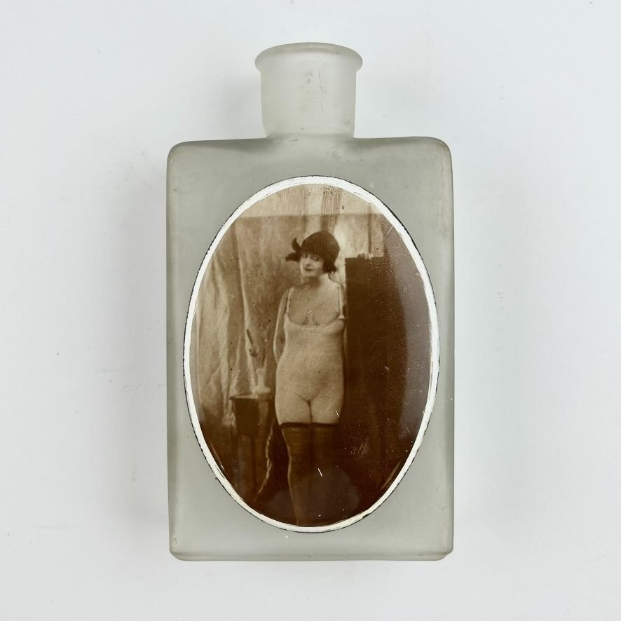 Frasco art decó para perfume, en vidrio prensado y esmerilado, decorado con tintipio oval erótico «Dama en el boudoir». 15.5 x 7.5 x 3.5 cm.