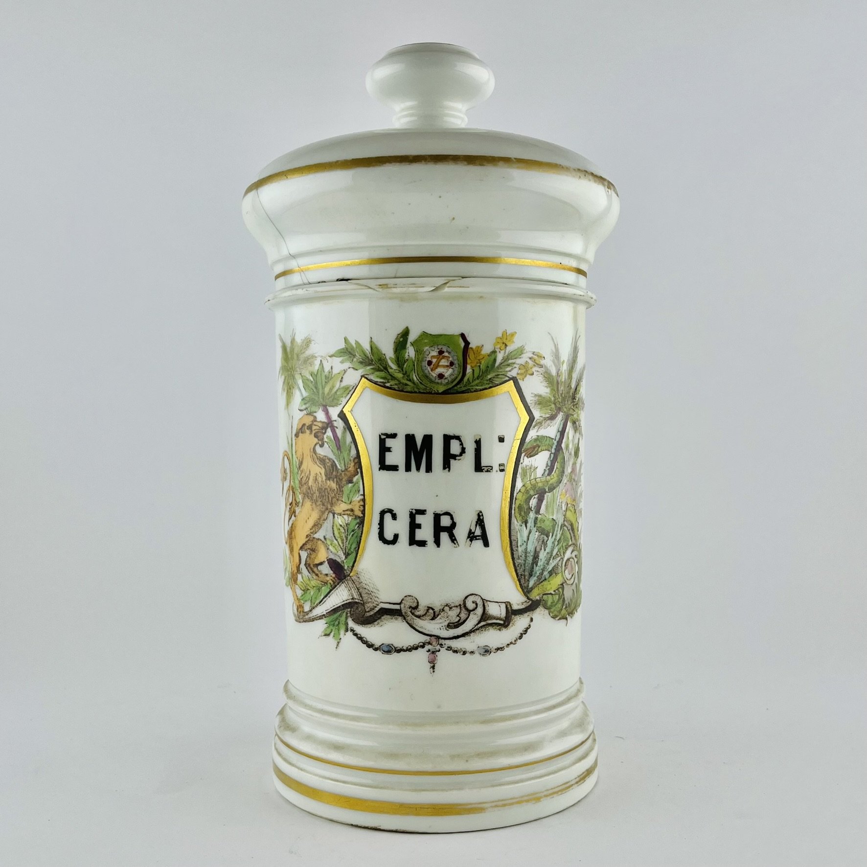 Frasco de farmacia en porcelana. Cartela pintada a mano “escudo imperial brasileño, león rampante, anaconda, hojas y palmeras”, con inscripción «EMPL: CERA». Guardas y realces en oro. Cascadura en boca y tapa. Restauración en boca. 28 x 14 cm.