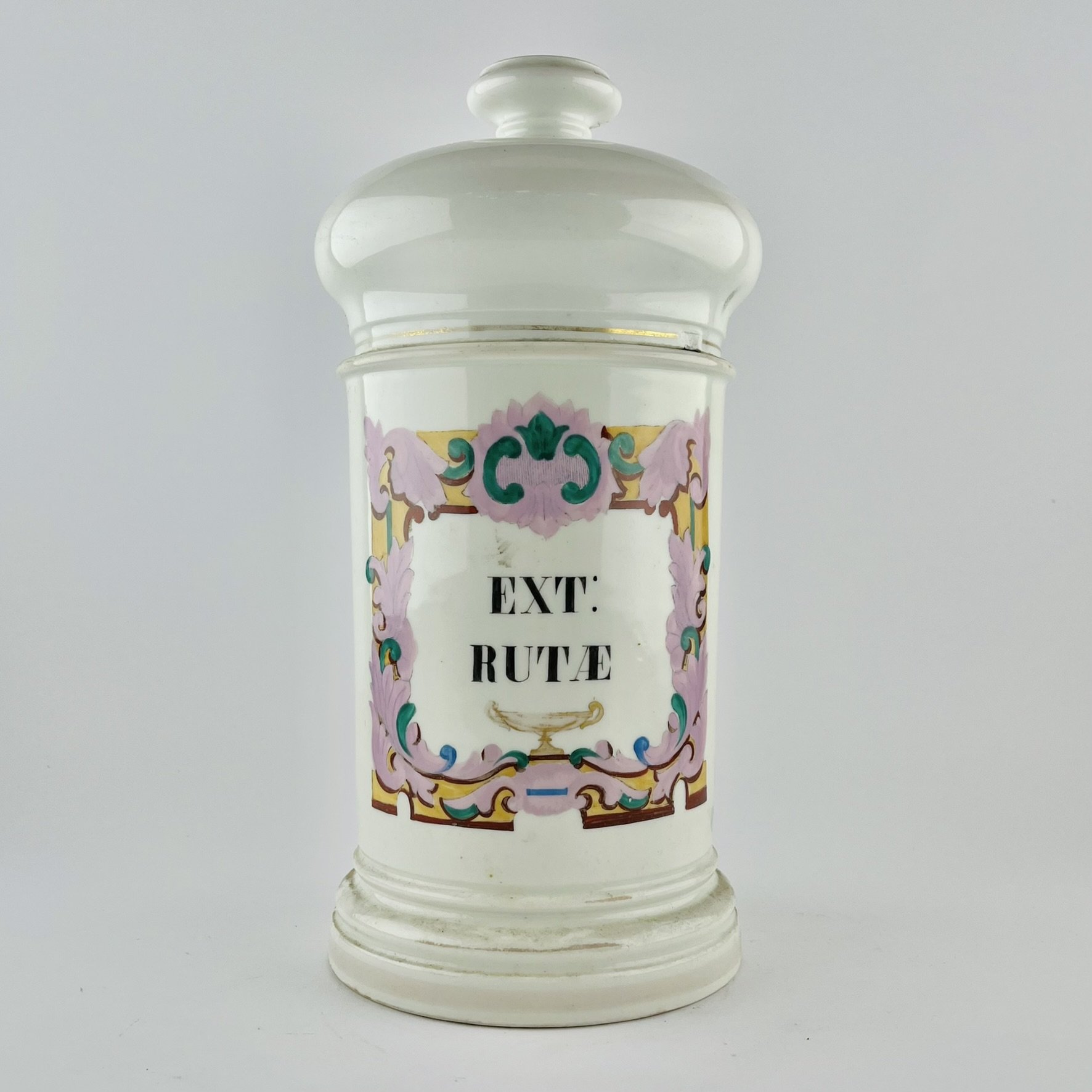 Frasco de farmacia en porcelana. Cartela pintada a mano con inscripción «EXT: RUTAE», decorada «hojas de acanto». Cascadura en tapa. 28 x 14.5 cm.