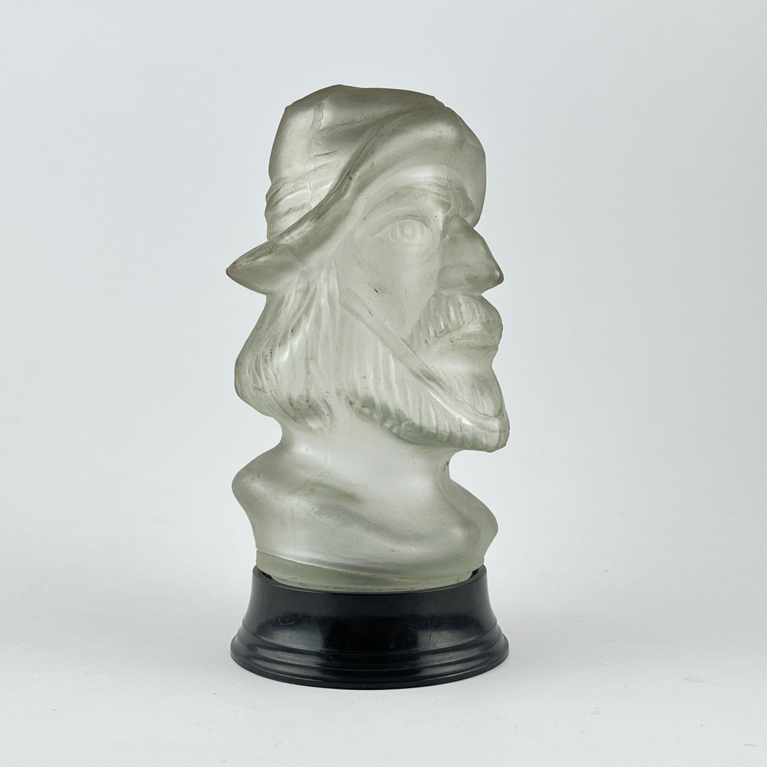 Frasco en vidrio prensado, esmerilado y esculturado «cabeza de gaucho», con tapón en baquelita negra. Alto 17 cm.