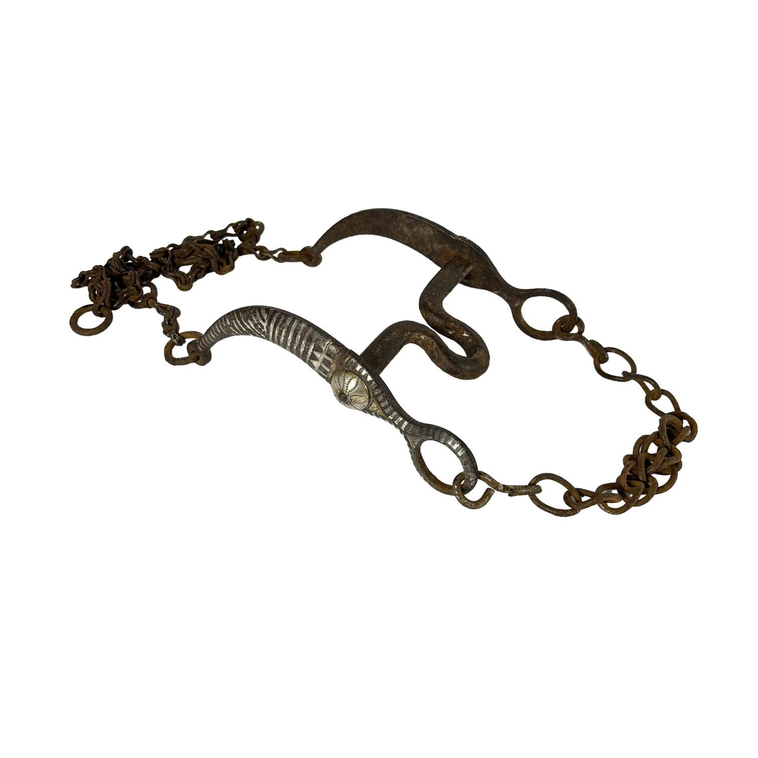 Freno mexicano c. 1850 en hierro forjado con decoración geométrica en plata, barbilla en eslabones de hierro forjado y cadena de rienda en eslabones de hierro trenzado, con retorcedor. Proveniencia: colección Familia von Buch, Argentina.