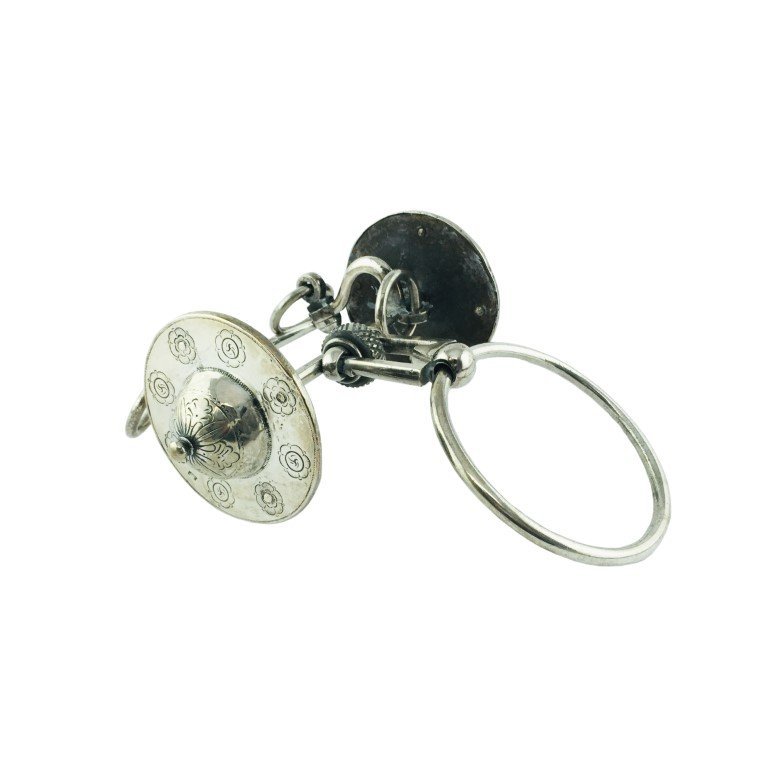 Freno mulero o de candado hispanoamericano s. XIX en plata. Copas en hierro forradas en plata cinceladas «hojas y flores». Punzón del platero no identificado, «J.P.» Diámetro de copas 10 cm. Peso bruto 950 gr.