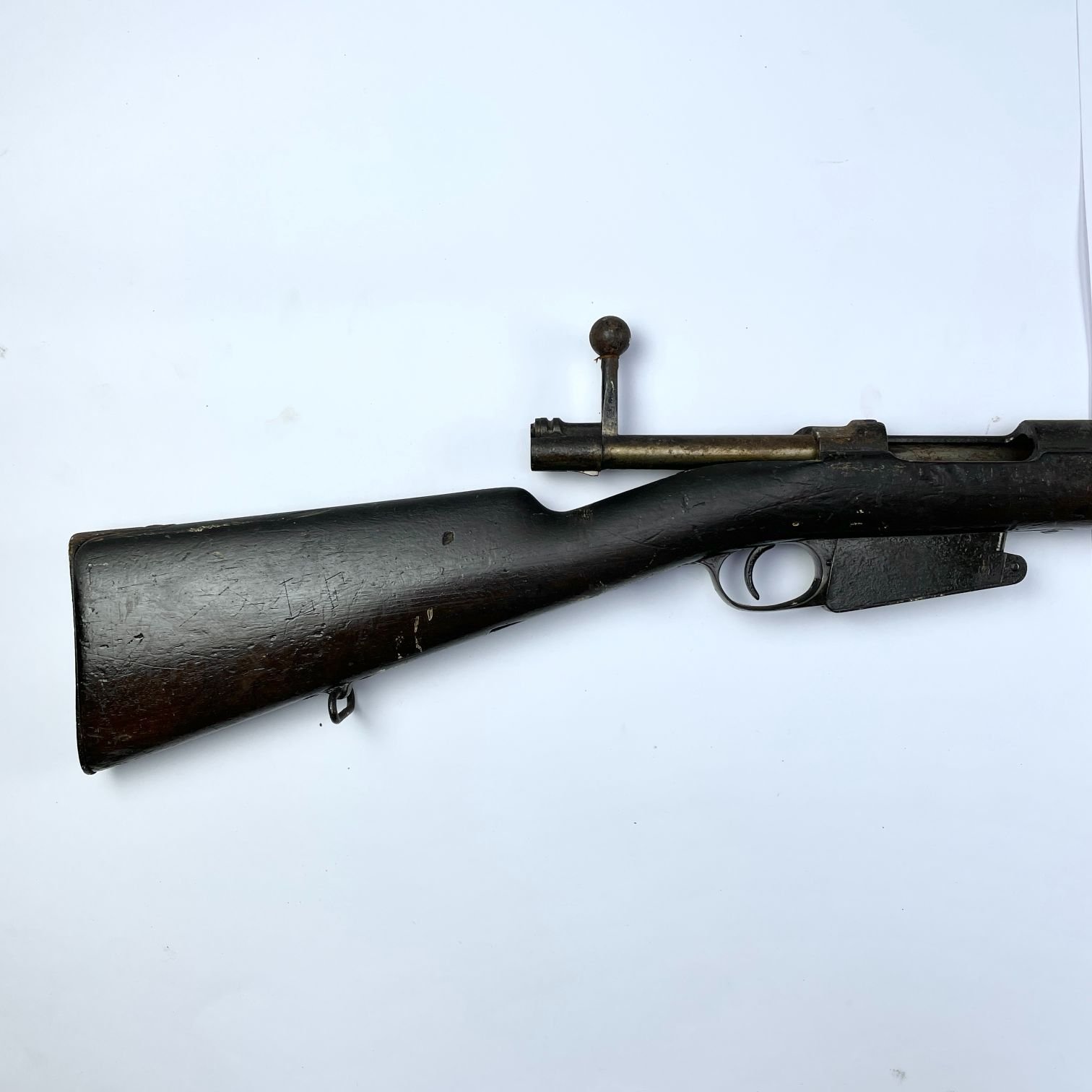 Fusil Mauser modelo 1889 calibre 7.55 x 54. No. de serie 2128. Fabricado en Bélgica por la Fabrique nationale d’Herstal, Lieja. No funciona.