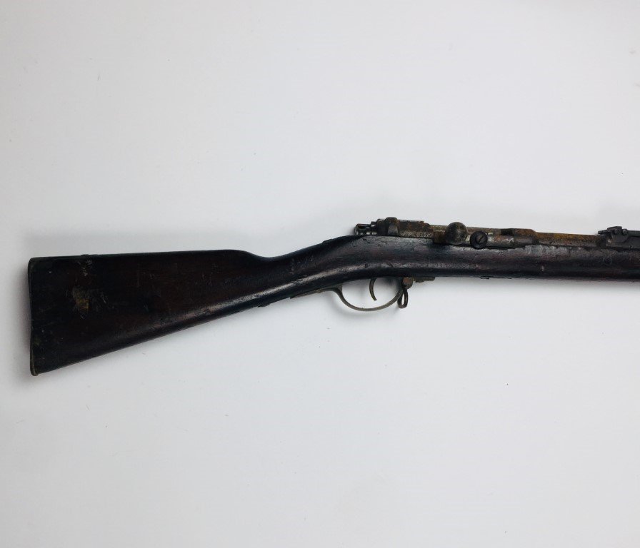 Fusil Mauser modelo 1871 calibre 11 Mauser. No. de serie 74548, correlativo en cerrojo y arma.