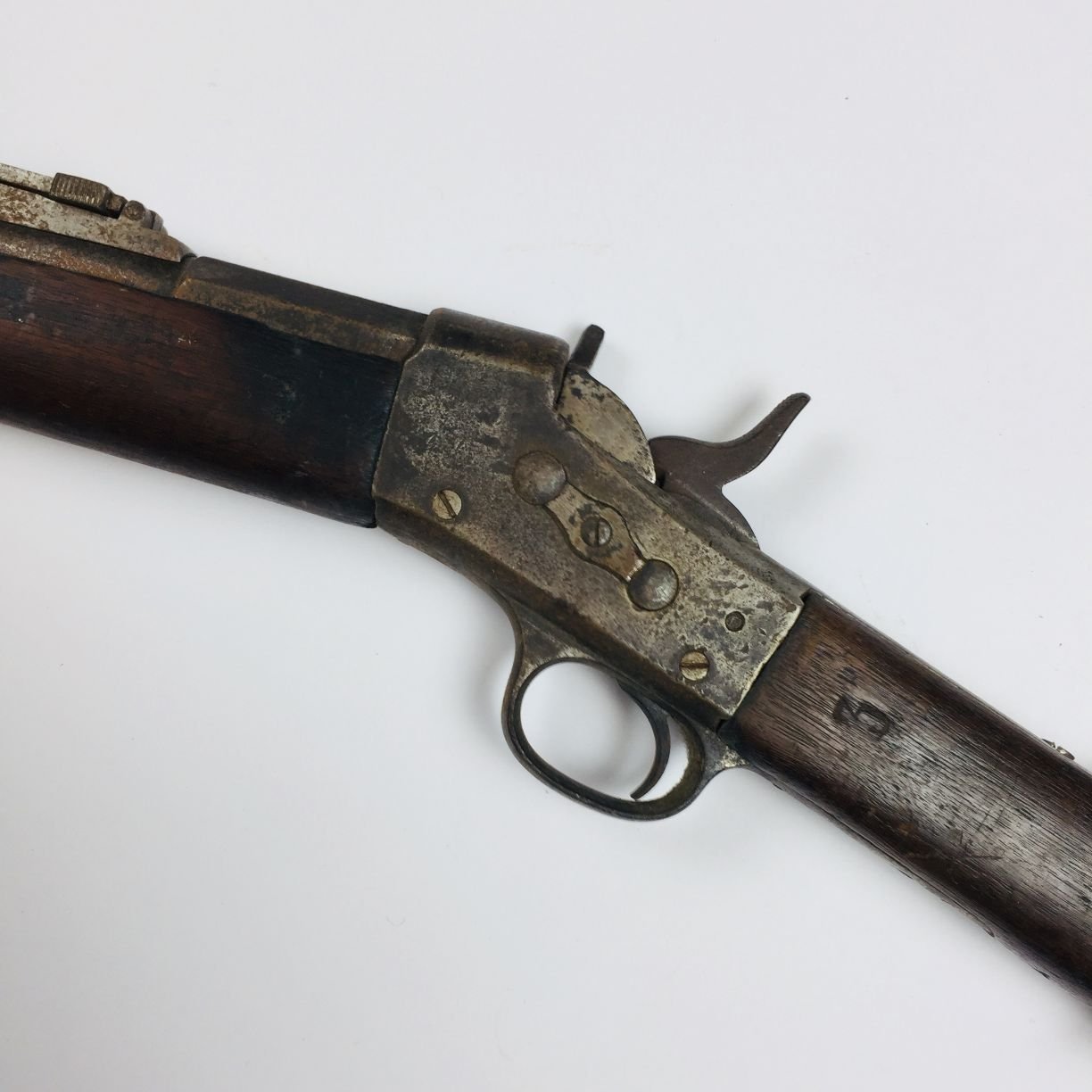 Fusil Remington Rolling Block transformado a carabina, calibre 11 mm modelo «patria» argentino. Caño marcado «Modelo Argentino 1876 E.N.». Funcionando.