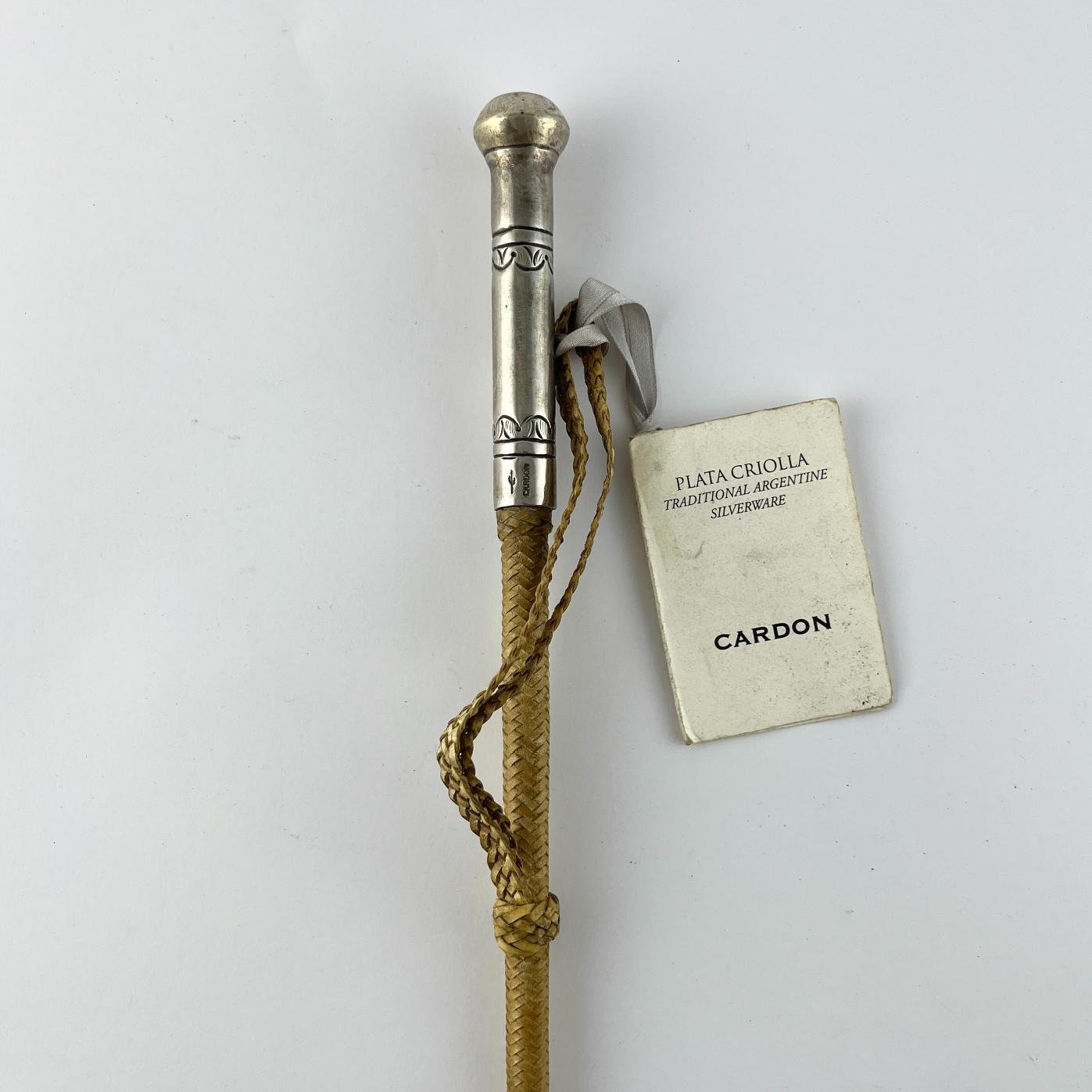 Fusta argentina marca Cardón forrada en fino cuero crudo trenzado, con cabo en plata cincelada «hojas», con punzón de la marca.