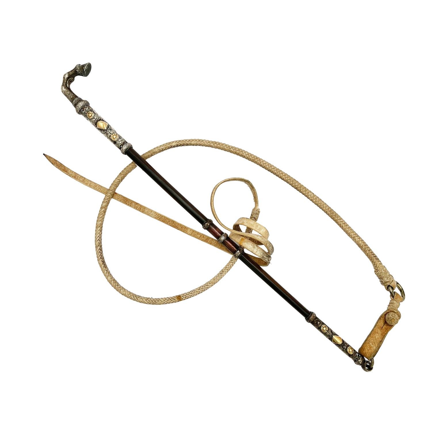 Fusta en bigote de ballena con cabo, pasador y puntera en plata y oro cincelados «hojas y flores». Cabo esculturado «pata de caballo». Sotera en fino cuero trenzado.