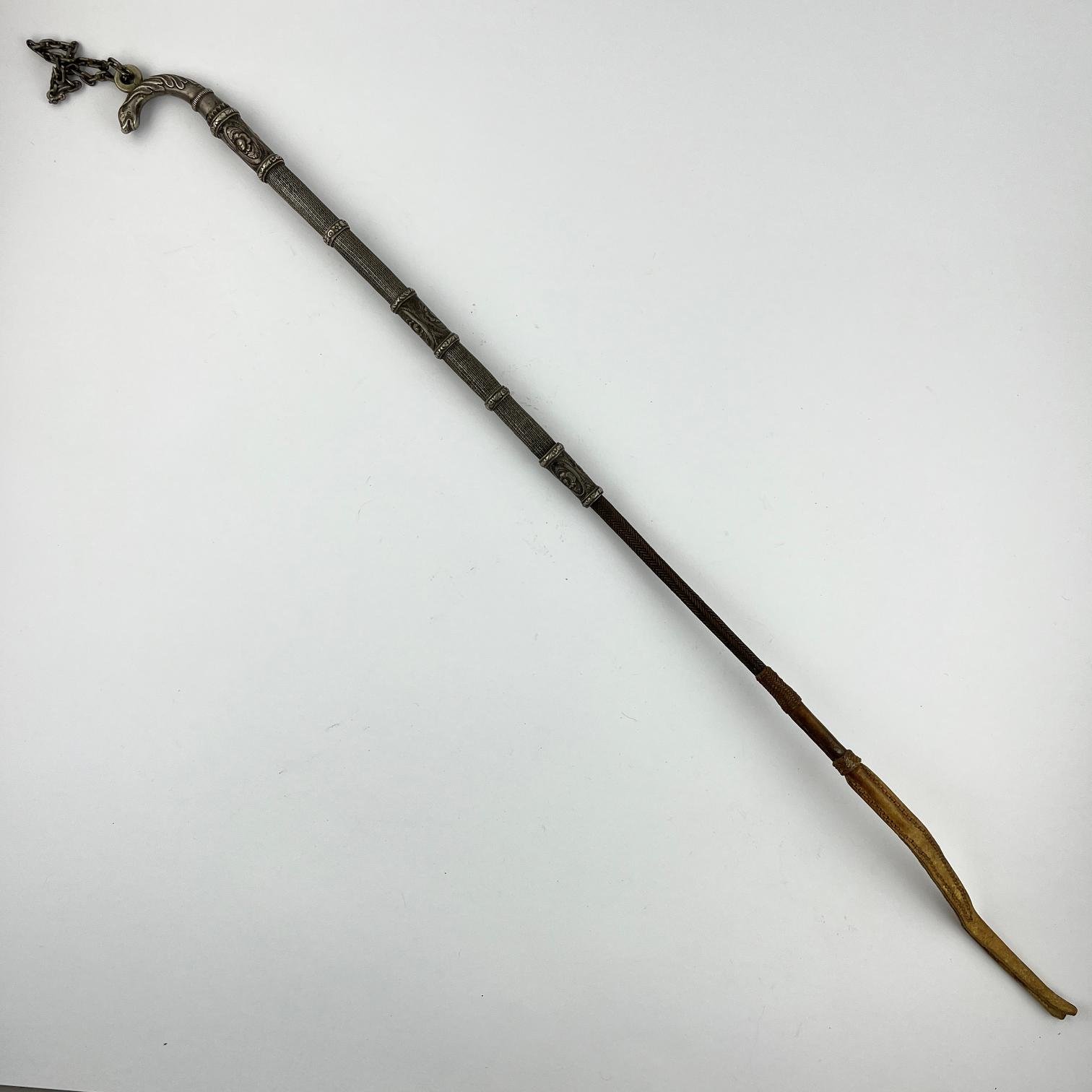 Fusta forrada en fino cuero trenzado y malla de plata, con cuatro pasadores y cabo cincelado «hojas y flores». Remate de cabo esculturado «cabeza de animal mitológico». Cadenilla en eslabones de plata.