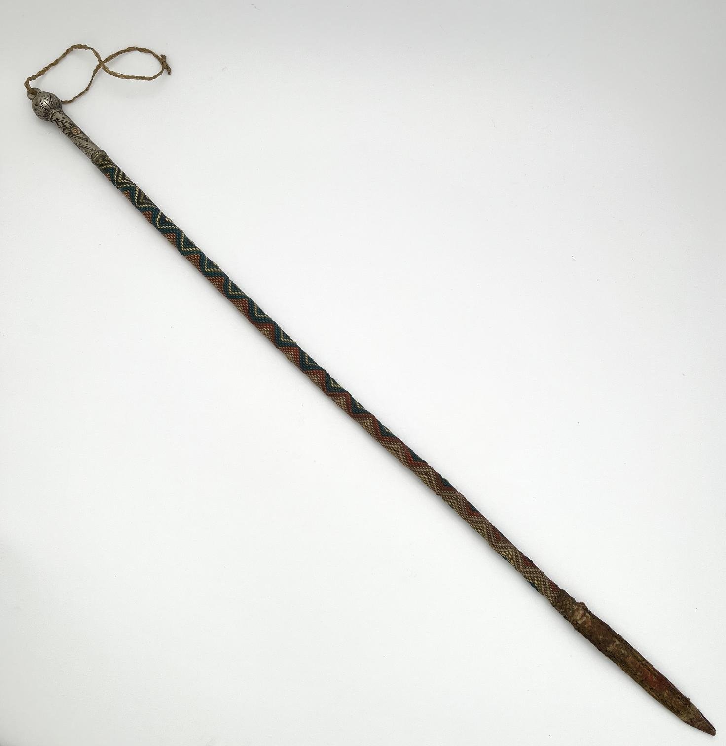 Fusta forrada en hilos de colores con decoración geométrica, con cabo de plata y oro cincelados «hojas y flores».