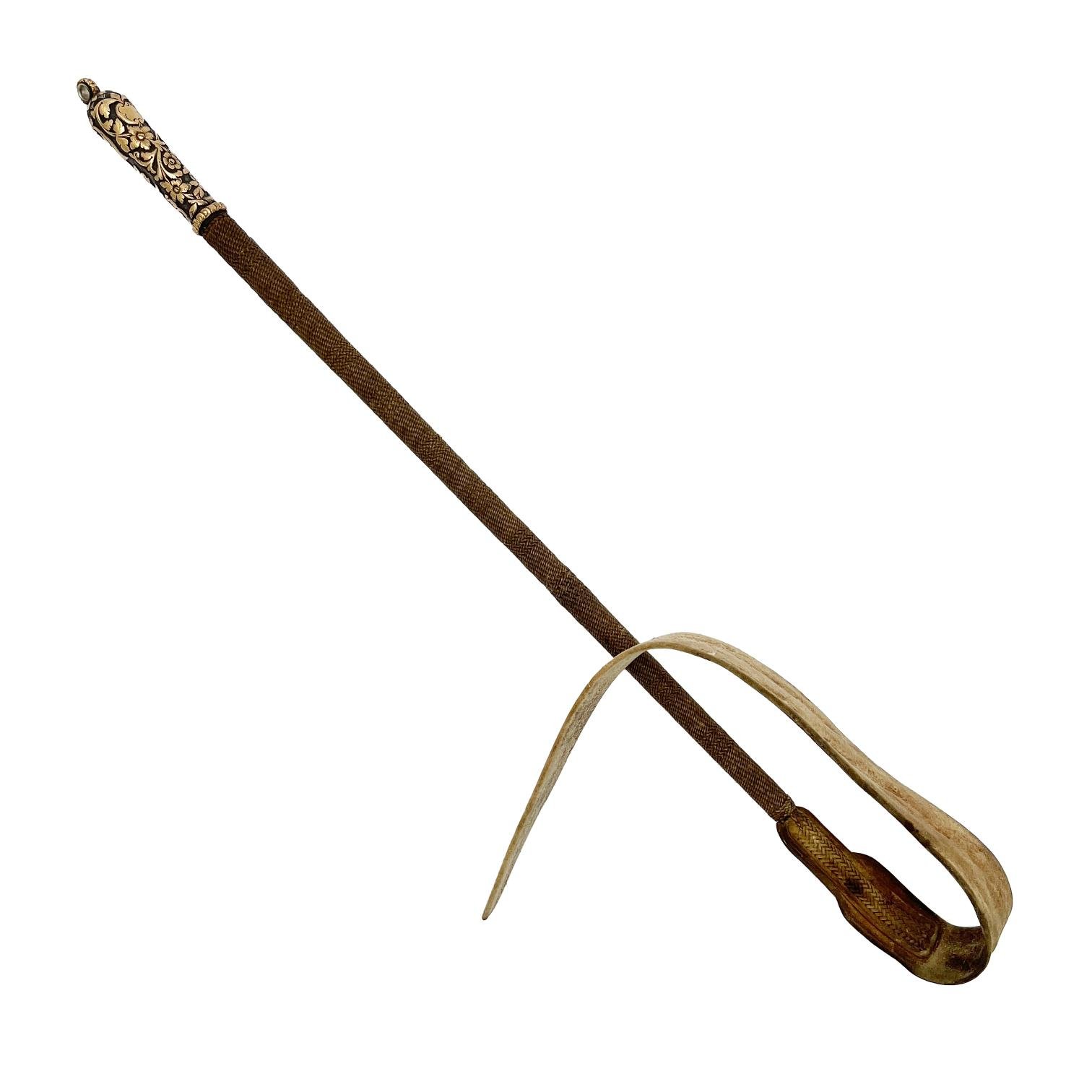 Fusta forrada en fino cuero trenzado con cabo en plata y oro cincelado «hojas y flores».