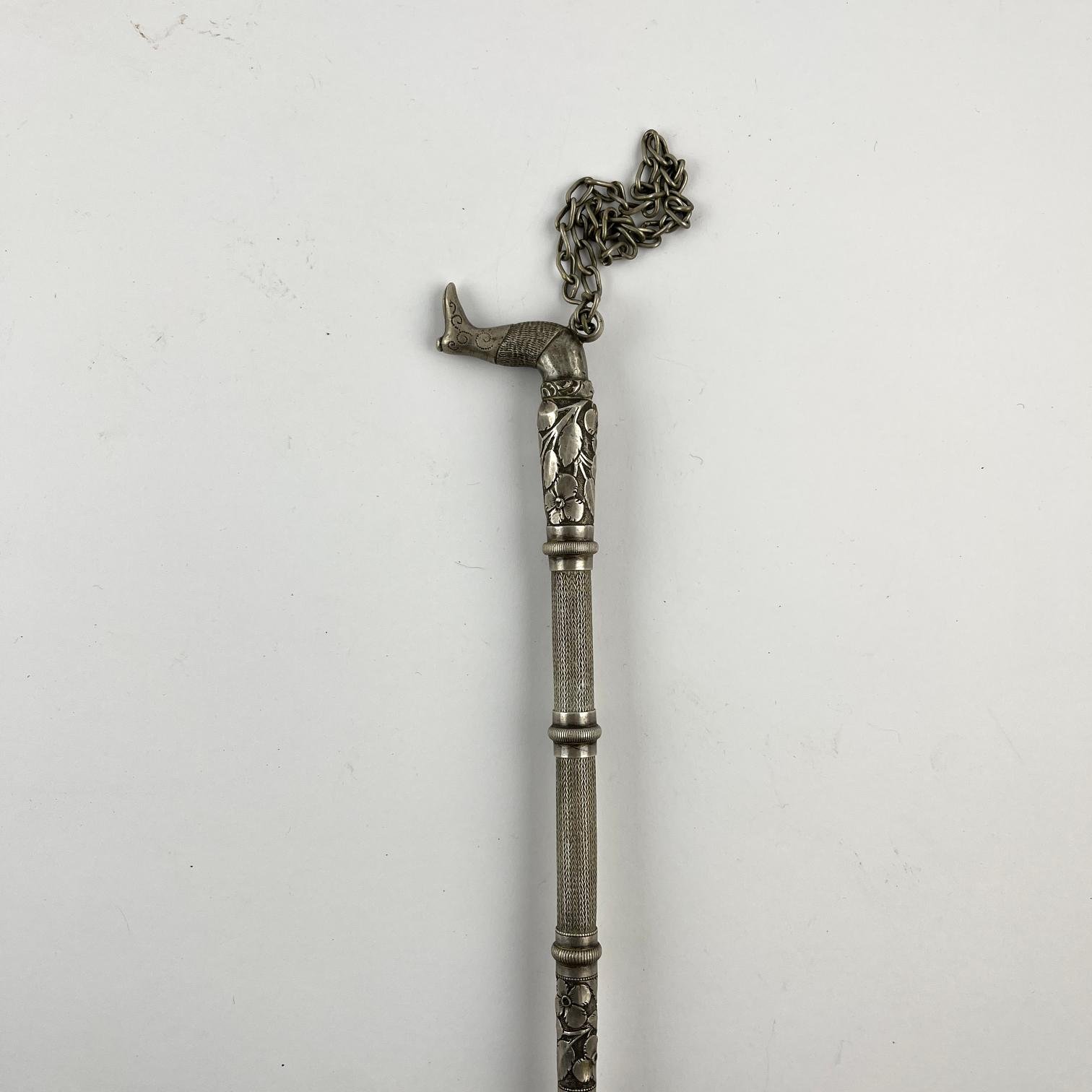 Fusta riograndense forrada en fino cuero trenzado, con cabo en malla de plata, un pasador en plata lisa y cabo y puntera cincelado «hojas y flores». Remate de pomo esculturado «pierna de dama», con cadenilla en plata.