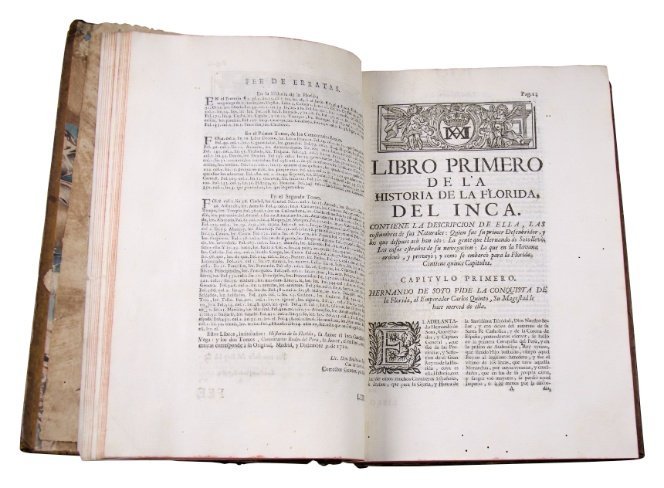 “La Florida del Inca — Historia del Adelantado Hernando de Soto, Governador, y Capitán del Reino de la Florida […]” Madrid, En la Oficina Real, y à Costa de Nicolas Rodríguez Franco, Impresor de Libros. Año 1723.