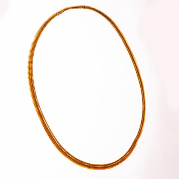 Gargantilla flexible en oro 18 K amarillo. Diámetro 6 mm. Largo abierto 42 cm. Peso 23,3 gr. Presenta pequeñas averías.