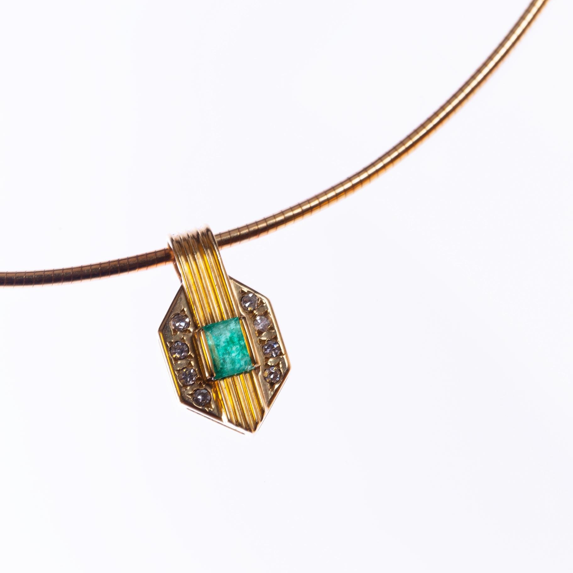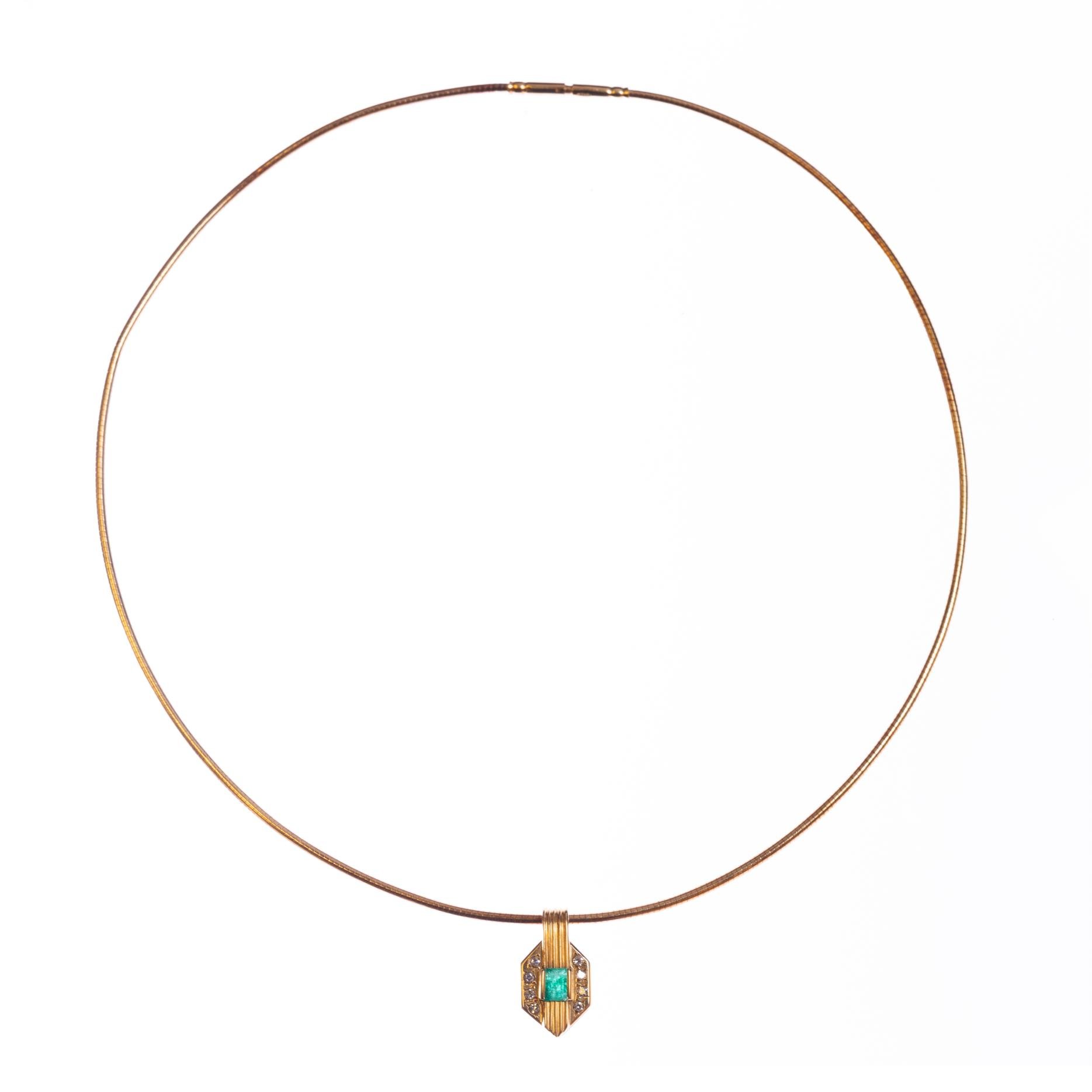 Gargantilla en oro 18 K amarillo con colgante en oro 18 K amarillo decorado con esmeralda central talla rectangular de 5,2 x 4,2 x 3,1 mm rodeada por ocho pequeños diamantes talla brillante. Diámetro 150 mm. Peso bruto 15 gr.