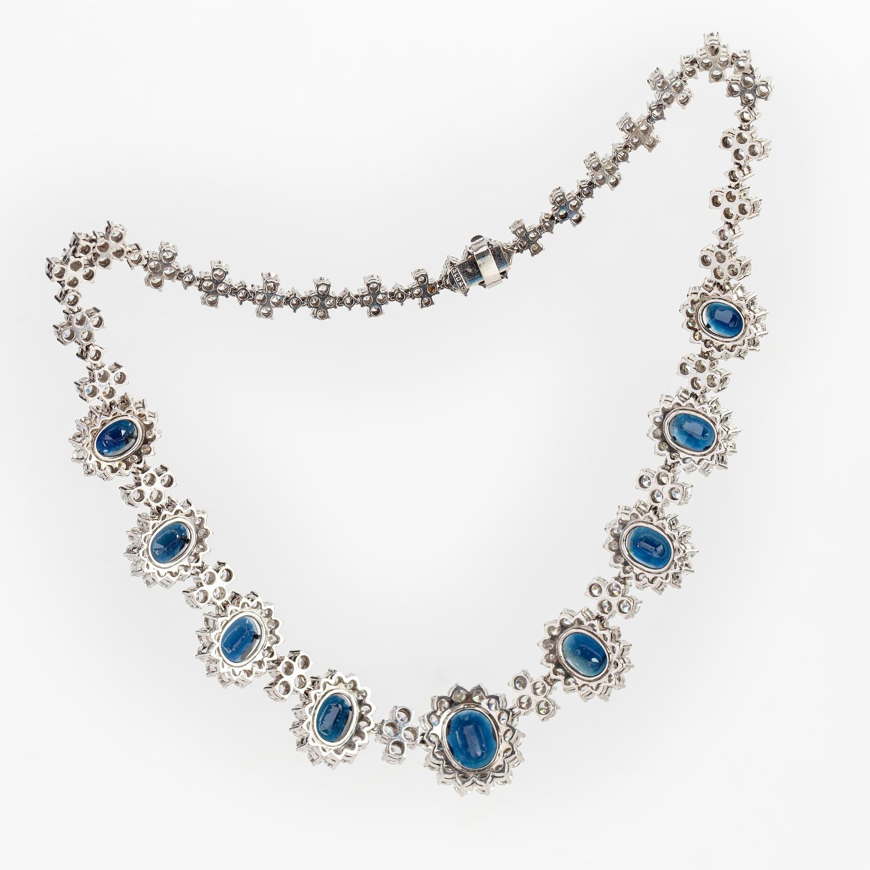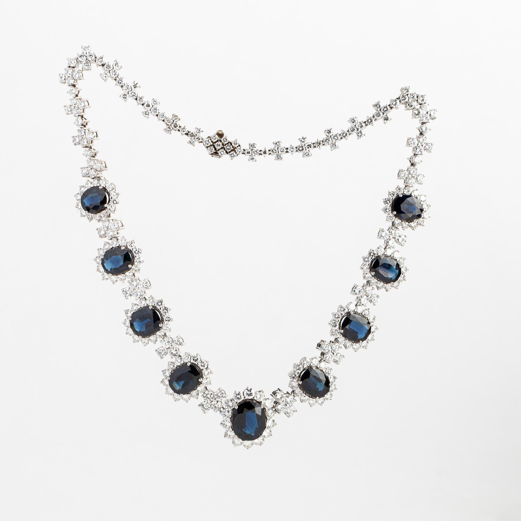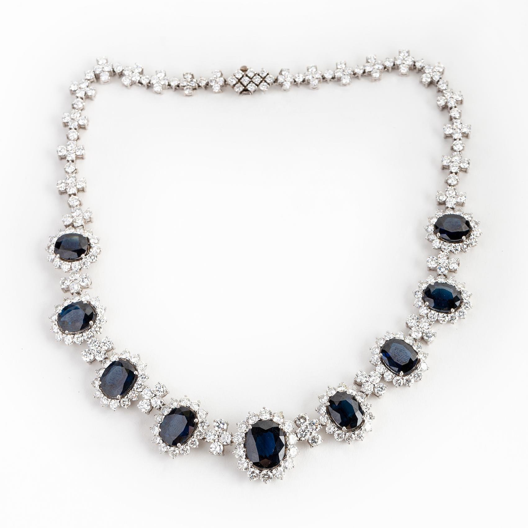 Gargantilla española en oro 18 K blanco totalmente decorada con doscientos sesentaidós brillantes en tamaño degradé de 0,20 a 0,05 ct. y nueve zafiros naturales talla oval en tamaños degradé de entre 13,5 x 10,9 x 4,7 mm (el mayor) y 10,5 x 8,3 x 4,5 mm (el menor). Con punzón de la joyería Aldao, España. Peso bruto 65 gr.