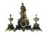 Garniture francés Segundo Imperio. Reloj en mármol negro tallado; cuadrante en mármol con números romanos tallados y dorados; base y monturas en bronce dorado; decorado con escultura «dama romana» en bronce dorado. 50 x 32 x 16 cm. Par de potiches en mármol negro tallado con base y copones en bronce dorado, uno con antigua pequeña restauración en mármol. 34 x 16 x 12 cm.