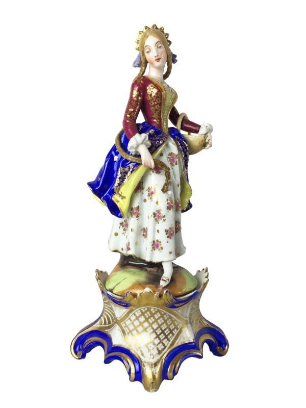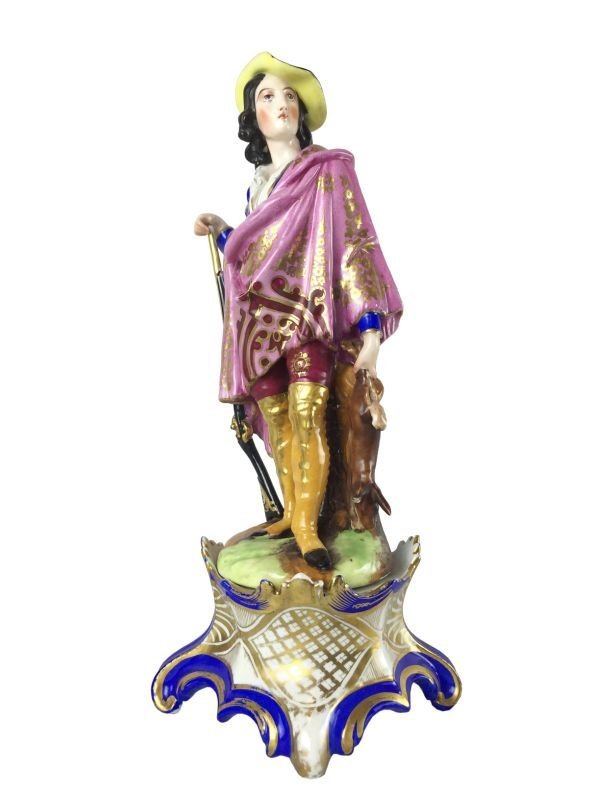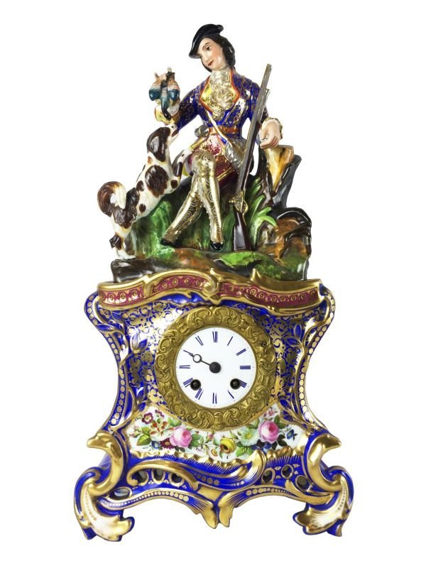 Garniture francesa en porcelana estilo Jacob Petit policromada. Compuesta por reloj con esfera esmaltada y números romanos, esculturado «cazador con perro», con pequeña fisura y vidrio faltante, 42 x 23 x 10 cm, y por dos pequeños floreros esculturados «cazador con liebre» y «dama con canasto», alto 37 cm. Reloj no funciona.