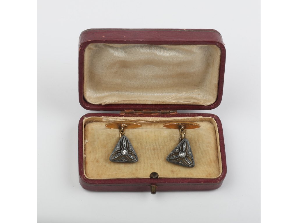 Par de gemelos art decó en oro amarillo y plata con uno pequeño brillante central y seis diamantes cada uno. En estuche original. Peso total 2.80 gr.
