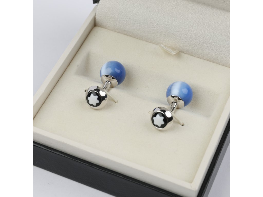 Par de gemelos Mont Blanc en plata 925 y esmalte, decorados con piedra Ojo de Gato en color azul. En estuche original.