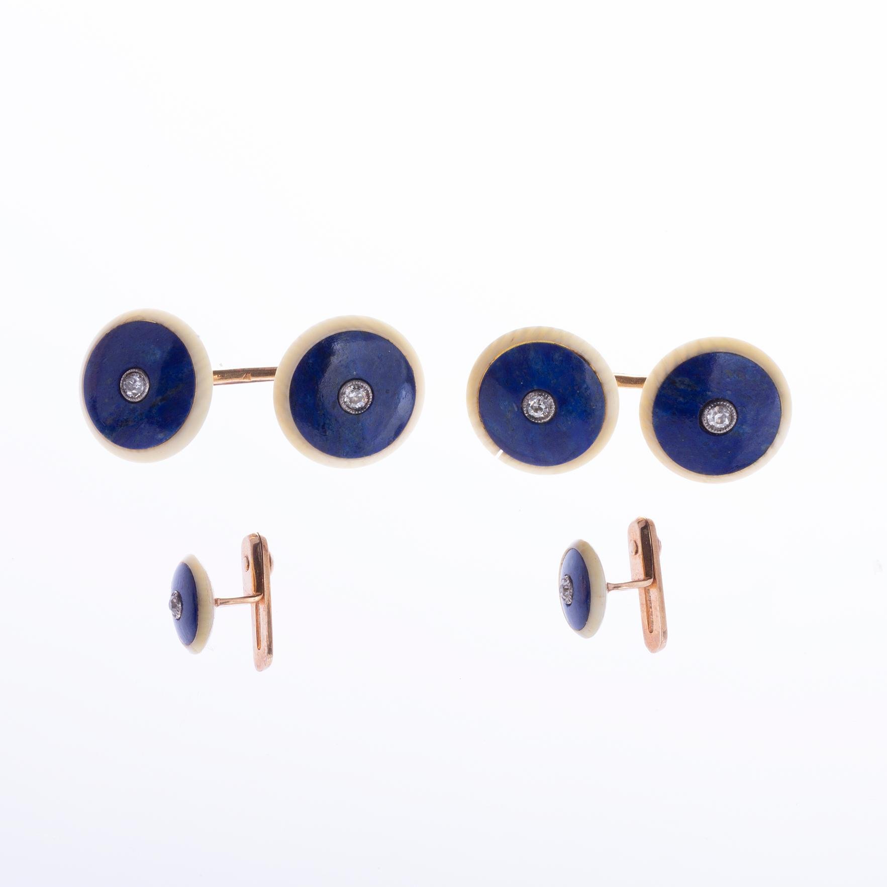 Gemelos y botones solaperos oro 18 K, lapislázuli, marfil y diamante
