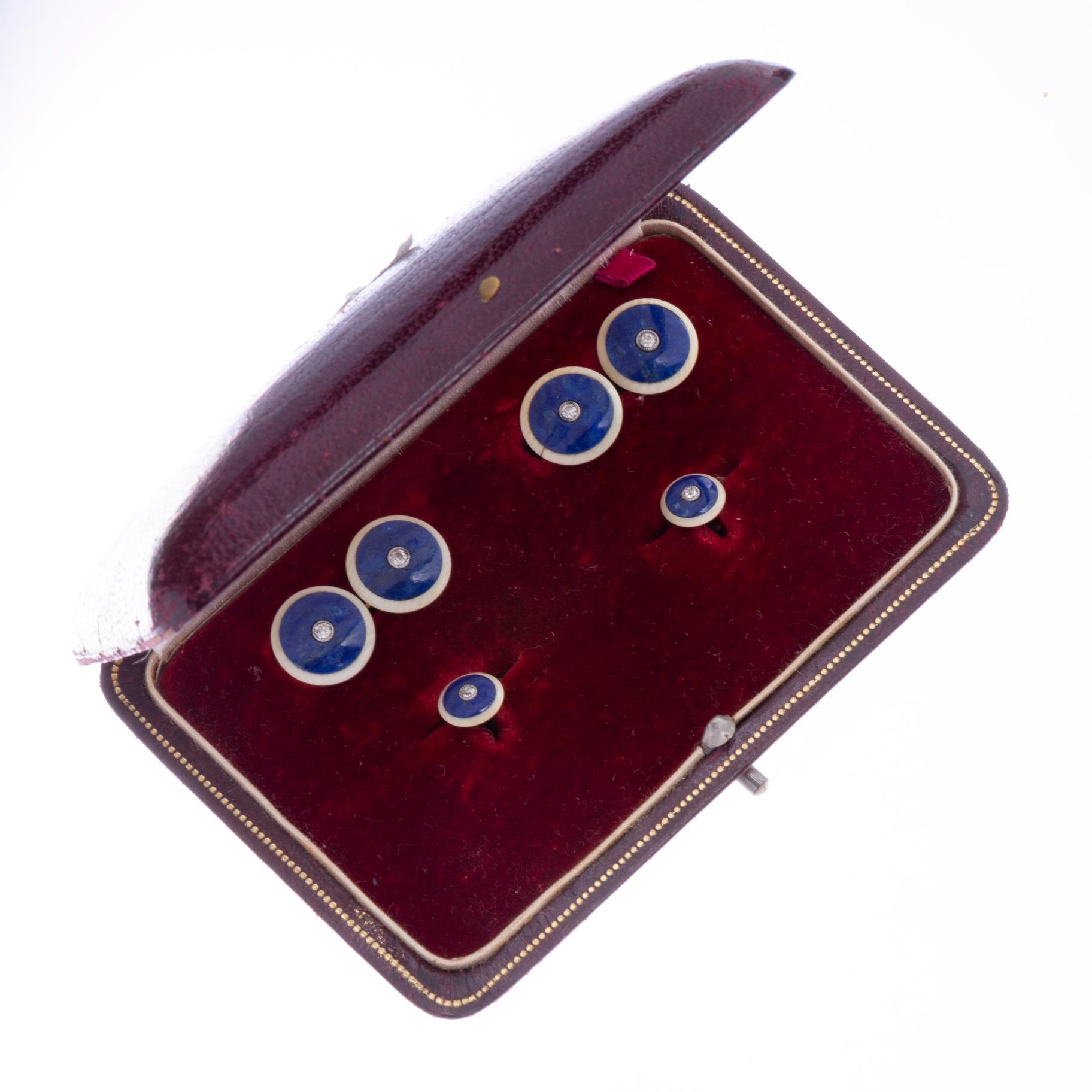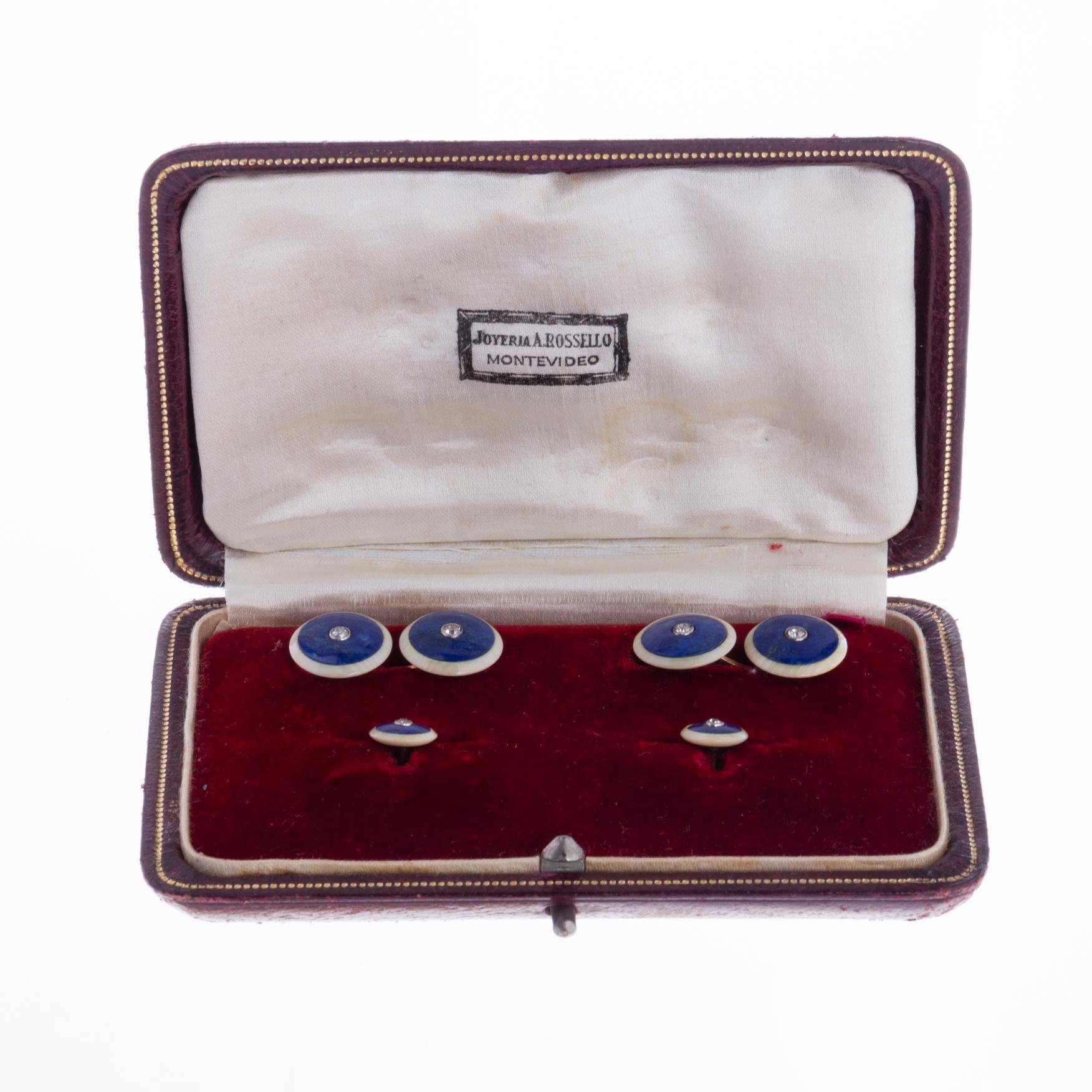 Juego de par de gemelos y par de botones solaperos en oro 18 K amarillo, lapislázuli y marfil, con pequeño diamante central talla brillante. Punzón europeo, no identificado. En estuche original forrado en cuero marrón.