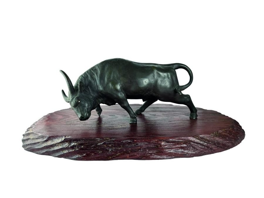 GENRYUSAI SEIJA (escuela japonesa, 1868-1912). Escultura en bronce, con ojos en vidrio. «Búfalo de agua.» Presentado sobre peana en madera tallada. Firmado en la base. Período Meiji. 20 x 43 x 12 cm.