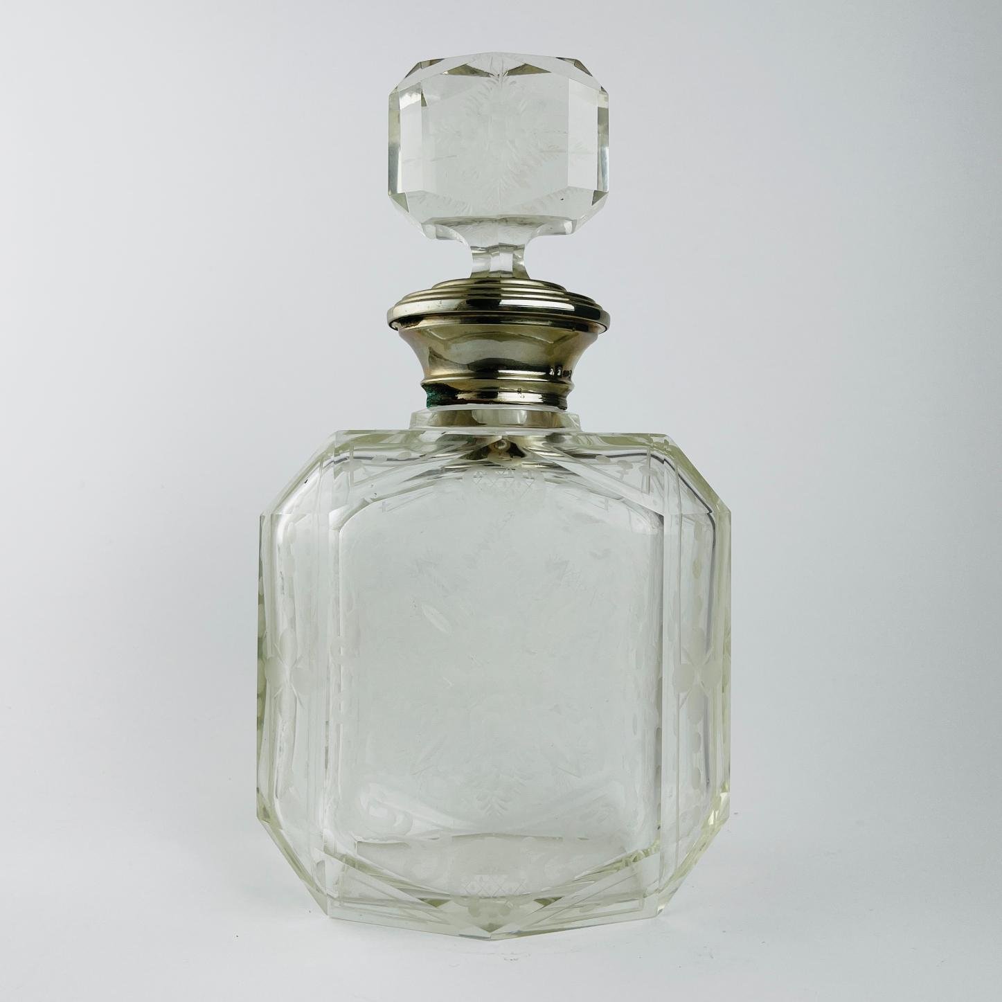 Par de botellones rectangulares en cristal facetado y tallado «hojas y flores». Virola en plata española lisa. Un tapón averiado. Alto 25 cm.