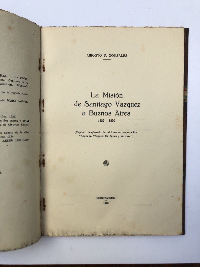 GONZÁLEZ, Ariosto: La misión de Santiago Vázquez a Buenos Aires. Montevideo, Reyes y Migues impresores. 1930. Encuadernación con lomo de cuero. Con sus tapas originales.