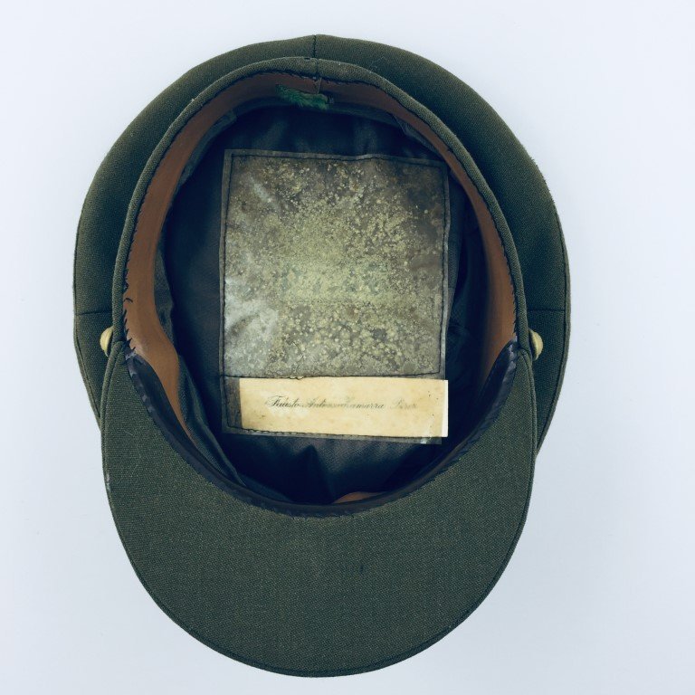 Gorra militar española tipo plato en paño color verde con insignia frontal bordada.