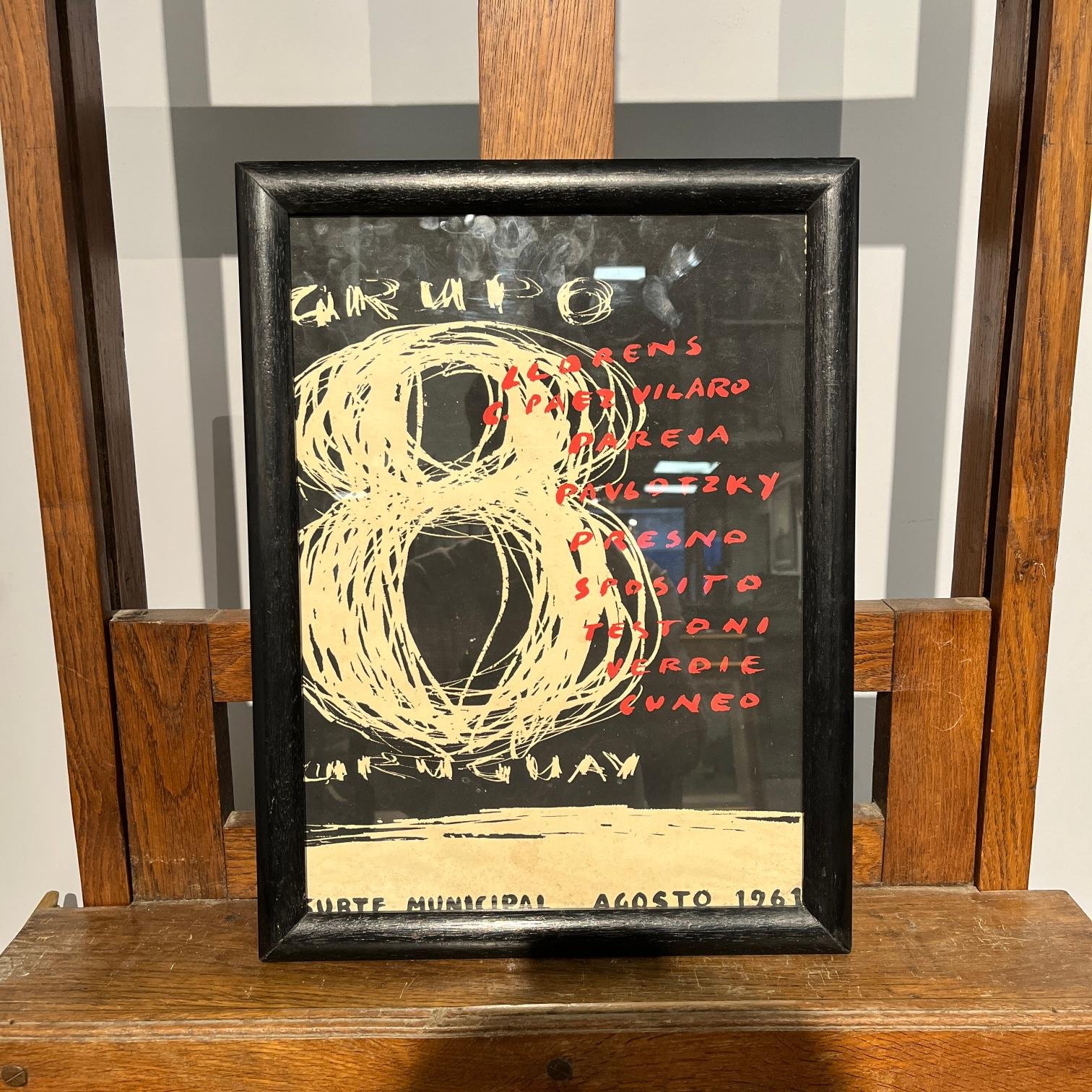 Afiche serigráfico para la exposición «Grupo 8» integrada por los artistas Antonio Llorens, Carlos Páez Vilaró, Miguel Ángel Pareja, Raúl Pavlotzky, Lincoln Presno, Américo Spósito, Alfredo Testoni, Julio Verdié y José Cuneo, realizada en el Subte Municipal de la ciudad de Montevideo en agosto de 1961