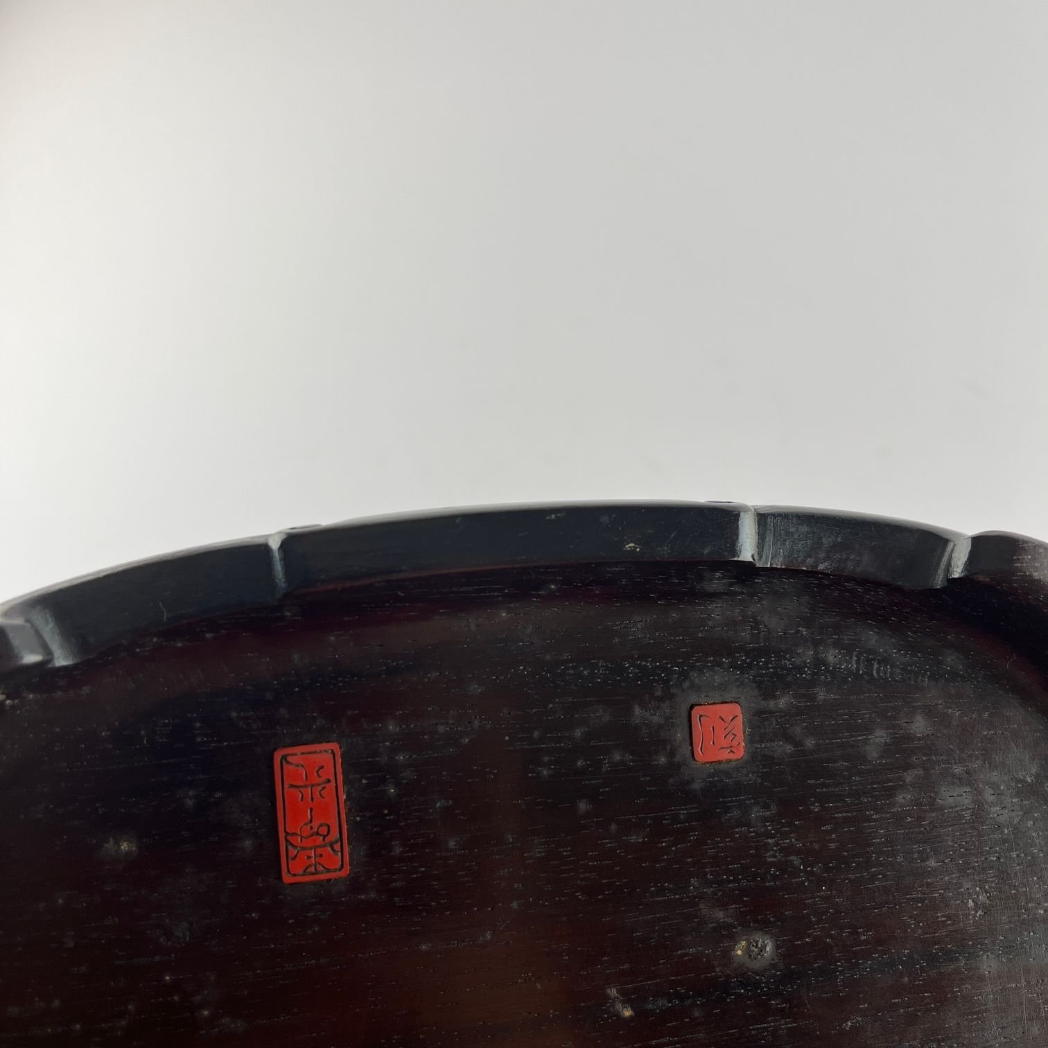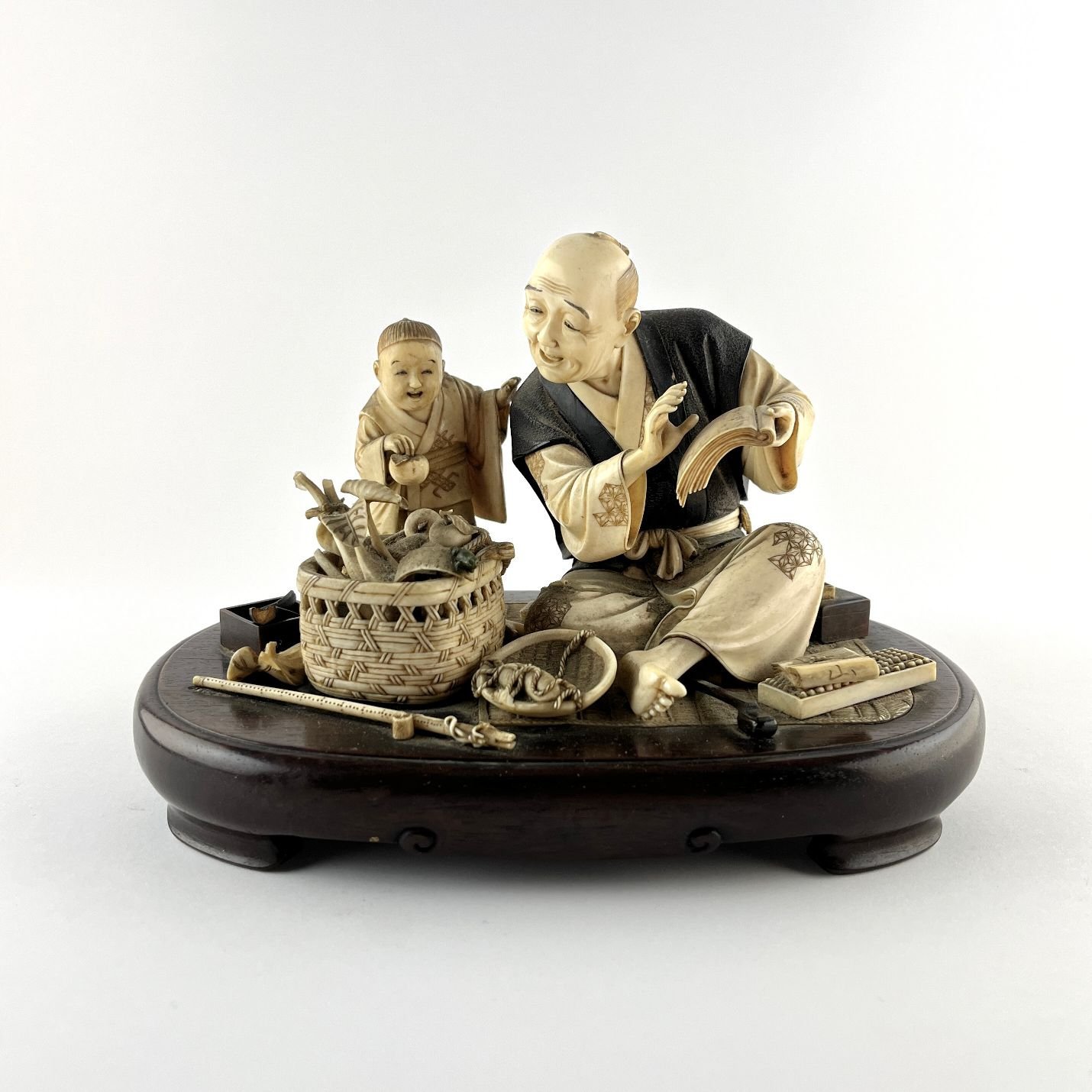 Grupo escultórico japonés okimono en marfil y ébano tallados, con detalle en jade y ónix. «Artes y Oficios.» Peana en madera tallada, con sellos rojos. Período Meji. 12.5 x 19 x 13 cm. Con averías.