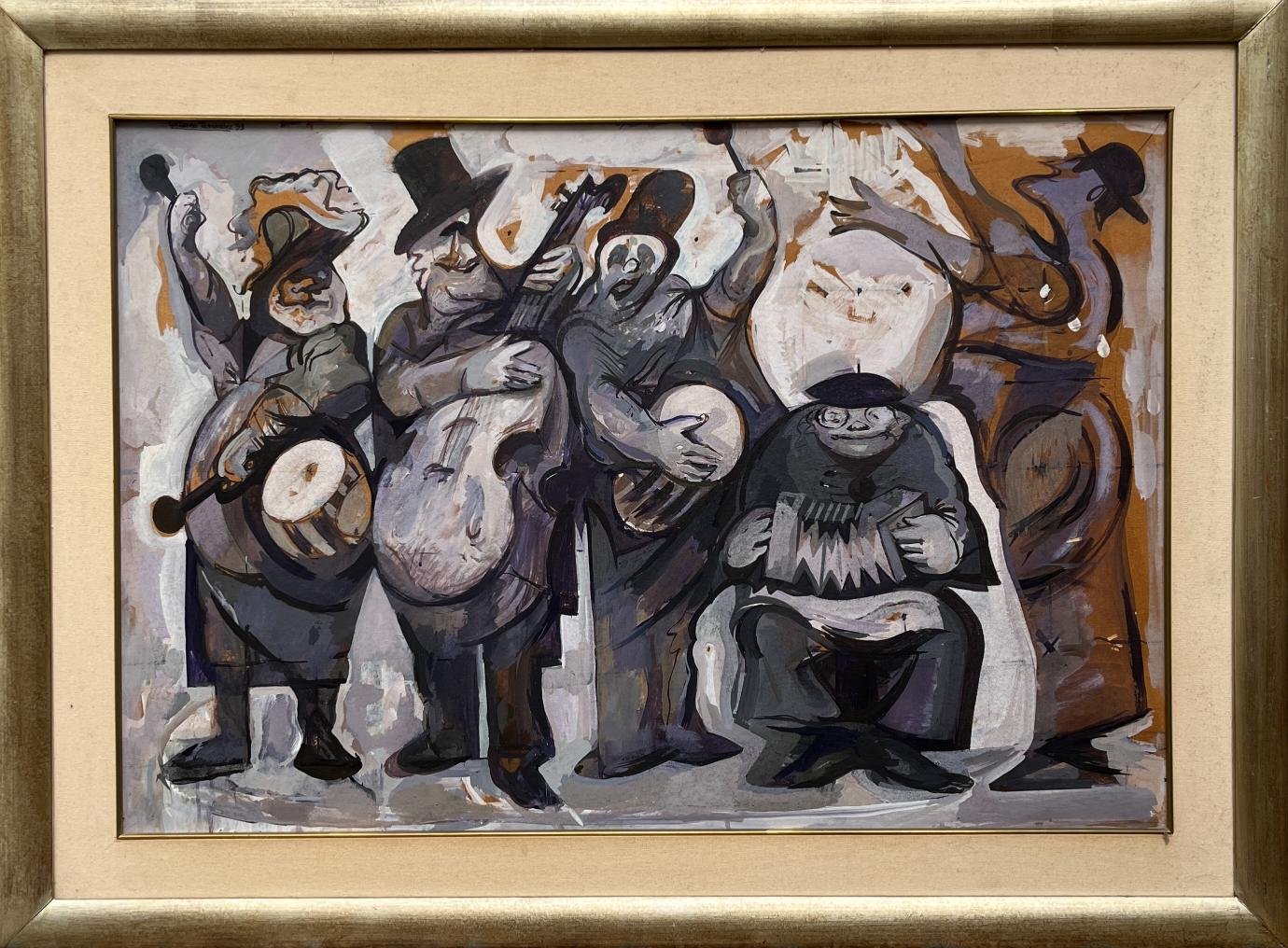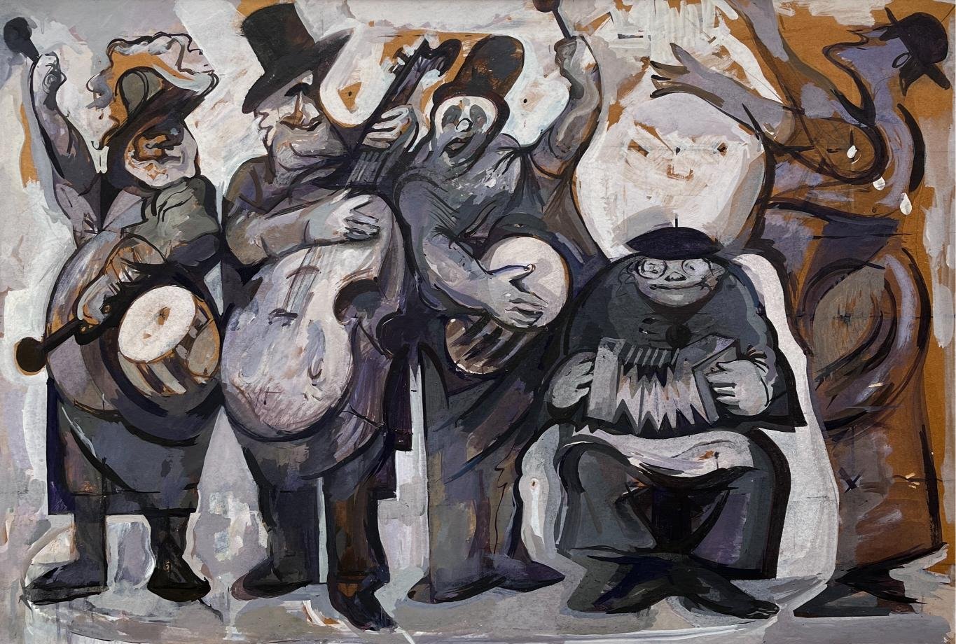 GUILLERMO FERNÁNDEZ (Escuela uruguaya, 1927-2007) Óleo diluido sobre cartón «La murga» Firmado y fechado «93» arriba a la derecha 95 x 65 cm