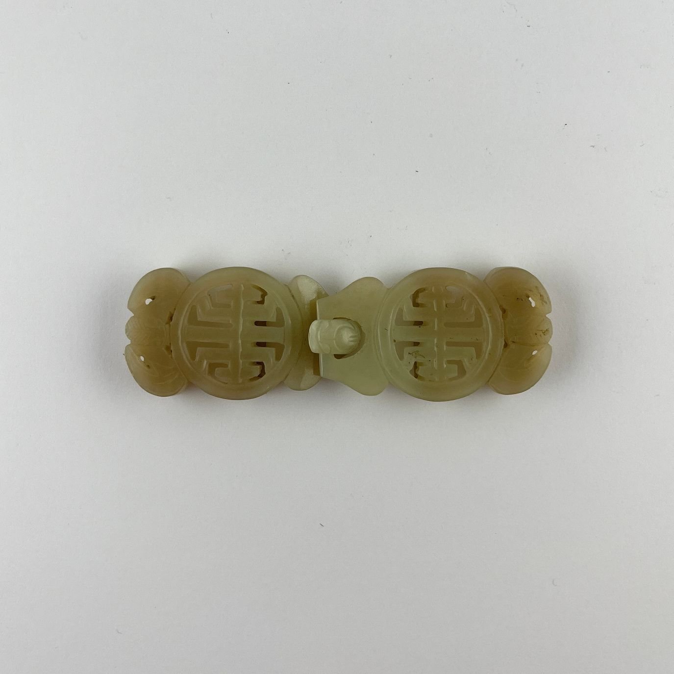 Hebilla china en jade celadón calado y tallado «símbolos shou y murciélagos». 3.3 x 11 cm.