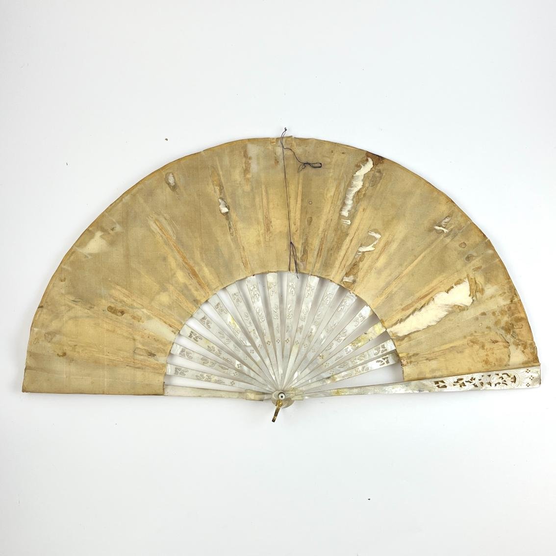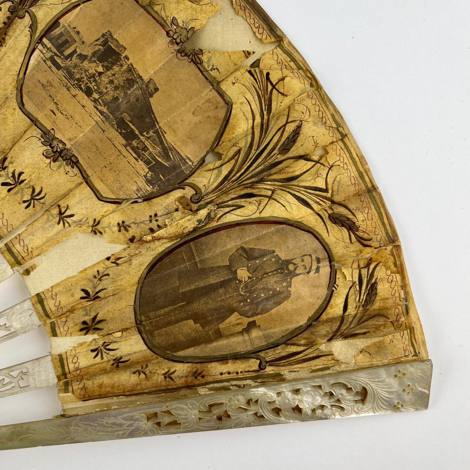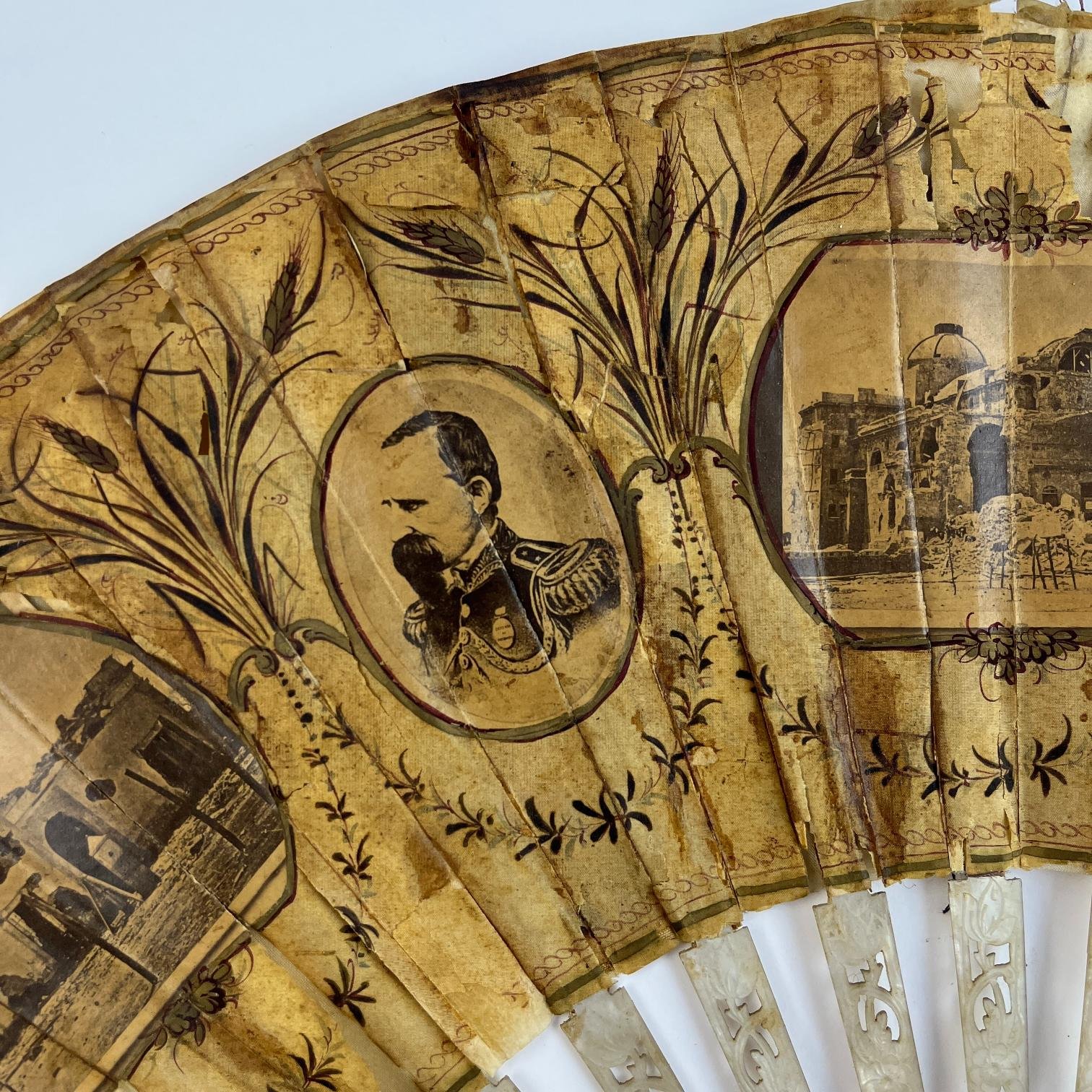 Histórico abanico conmemorativo de la Defensa de la Heroica Paysandú, s. XIX. Dieciocho brazos en nácar calado «hojas y flores». País en papel color blanco decorado con fotografías de las ruinas de la ciudad de Paysandú tras el Sitio impuesto por tropas del Gral. Venancio Flores y del Imperio del Brasil, e imágenes de personajes caídos en la Defensa: Leandro Gómez, Lucas Píriz, Tristán Azambuya y Juan Manuel Braga. Pequeñas averías. Presentado en abaniquera de madera dorada.