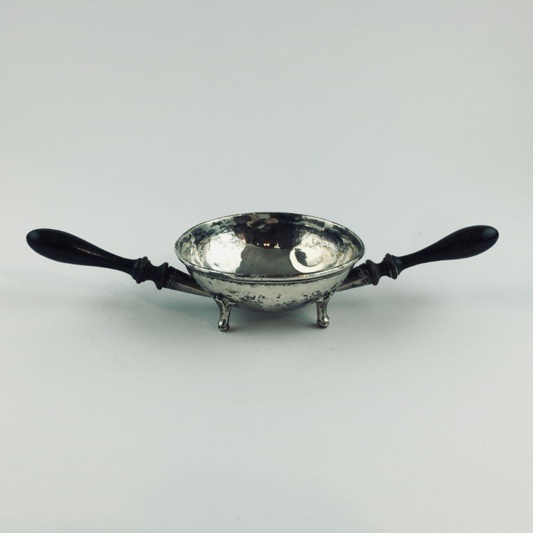Hornillo o brasero español para incienso, siglo XIX, en plata martelé. Cuatro patas, cazoleta con borde liso y dos asas en madera torneada y ebanizada. 4.5 x 21.5 x 8.5 cm.