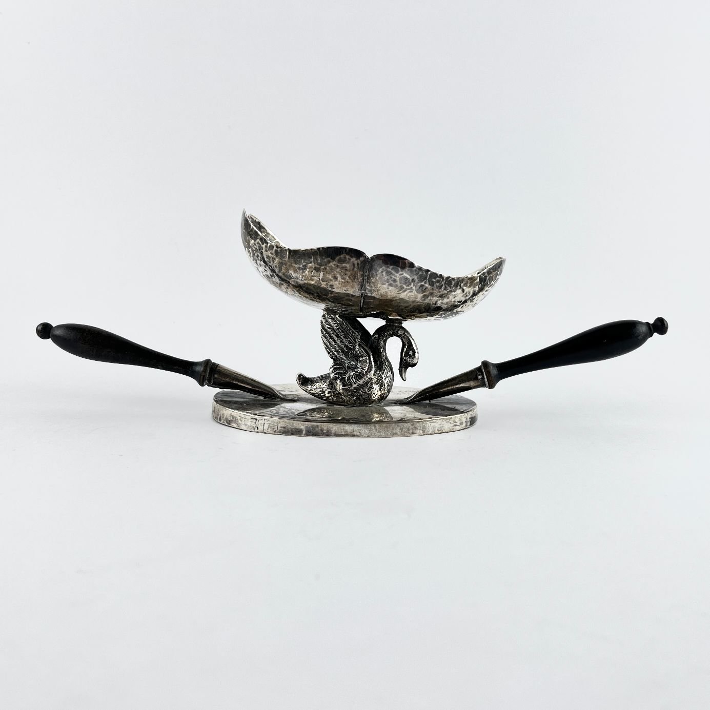 Braserillo español s. XIX en plata martelé, con pie esculturado “cisne”, cazoleta con borde en ondas, base en plata lisa y dos asas en madera torneada y ebanizada. Punzón del orfebre Majá. 8.5 x 26 x 8.5 cm.