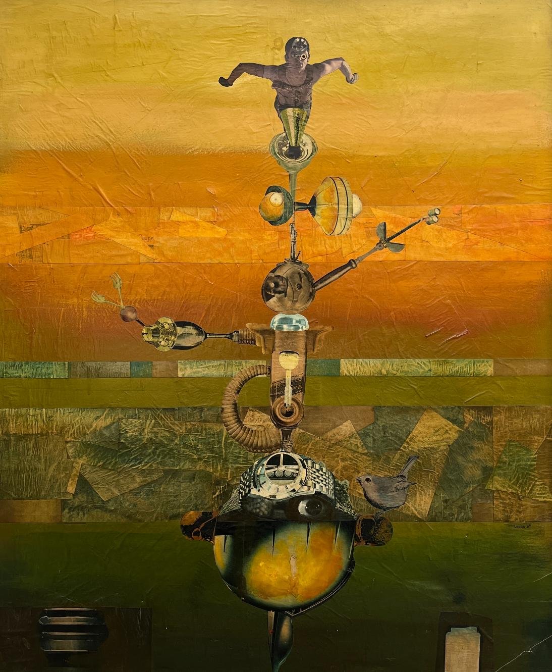 HUGO LONGA (Escuela uruguaya, 1934-1990) Esmalte y collage sobre tela «El gran salto» Al dorso firmado, fechado «1967», titulado y medido por el artista 120 x 100 cm