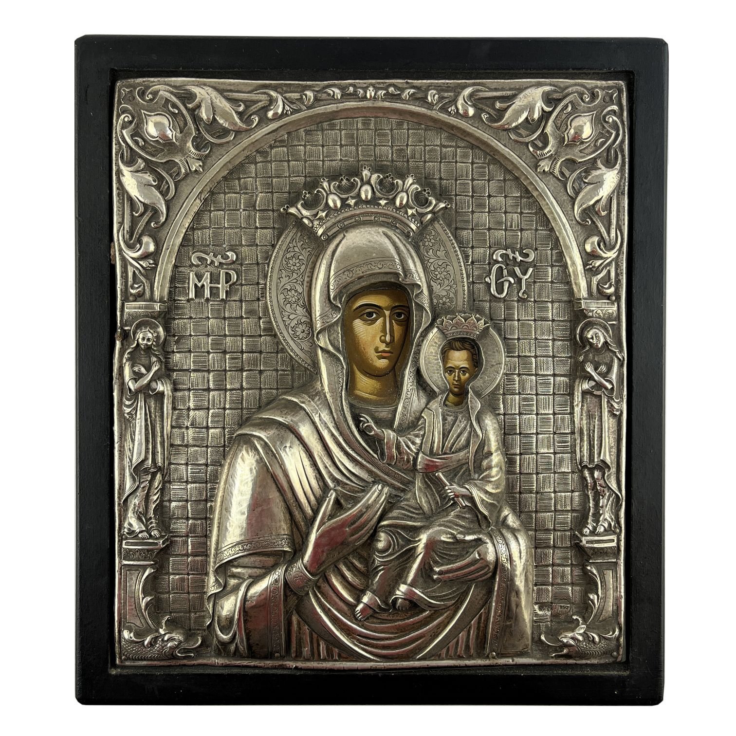 Ícono griego pintado a mano sobre cartón con coronación en plata repujada. «Virgen con niño.» 35 x 31 cm. Presentado sobre tabla de madera.